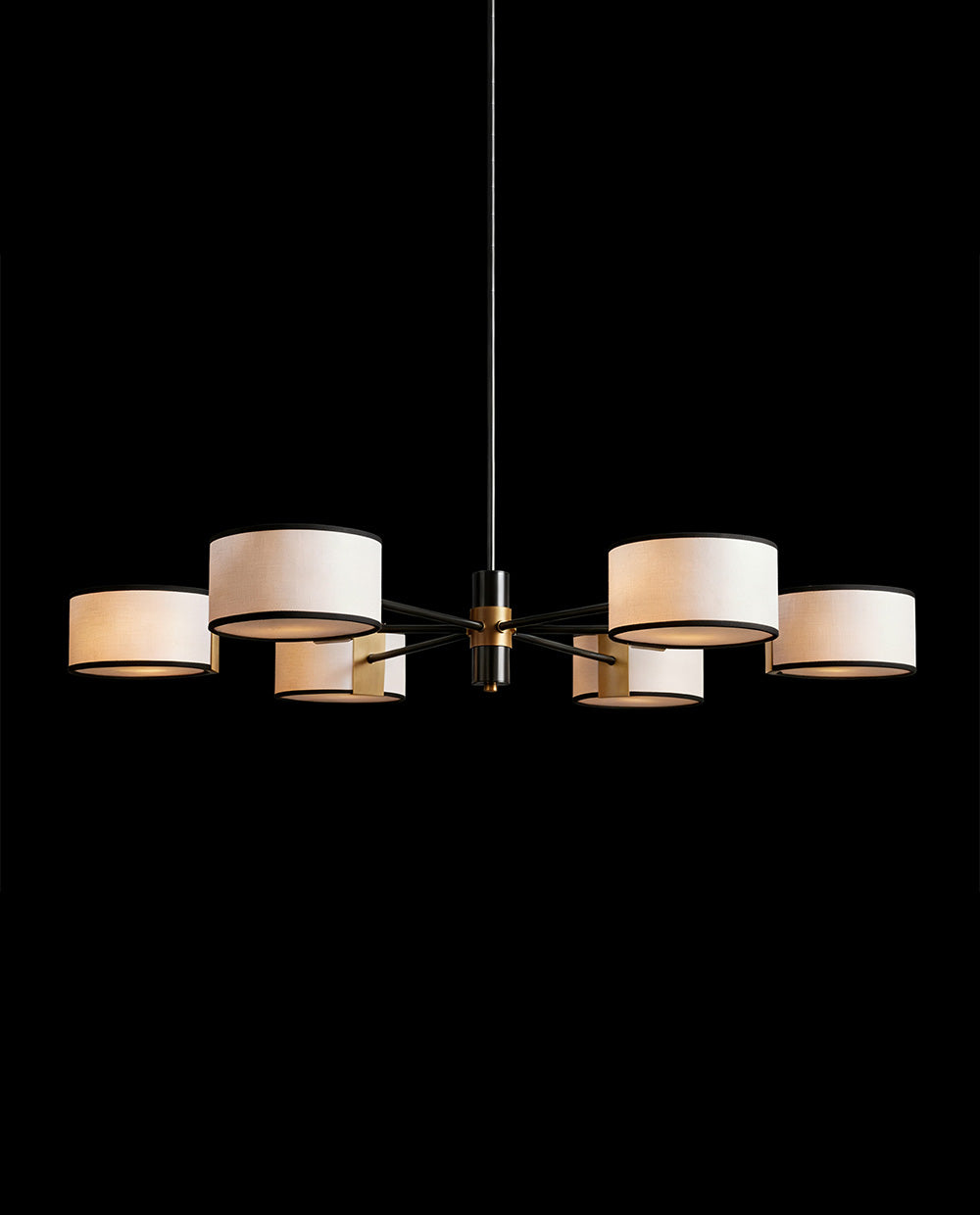 This chandelier is made of metal and fabric, with a light bronze finish for a minimalist and elegant look. It features 6 E26 light sources hidden in beige fabric lampshades. The radial metal branch design is modern and flexible, and the fabric softens the light. Suitable for various spaces, it offers customizable size and finish, making it a clever combination of minimalist style and practical functionality.