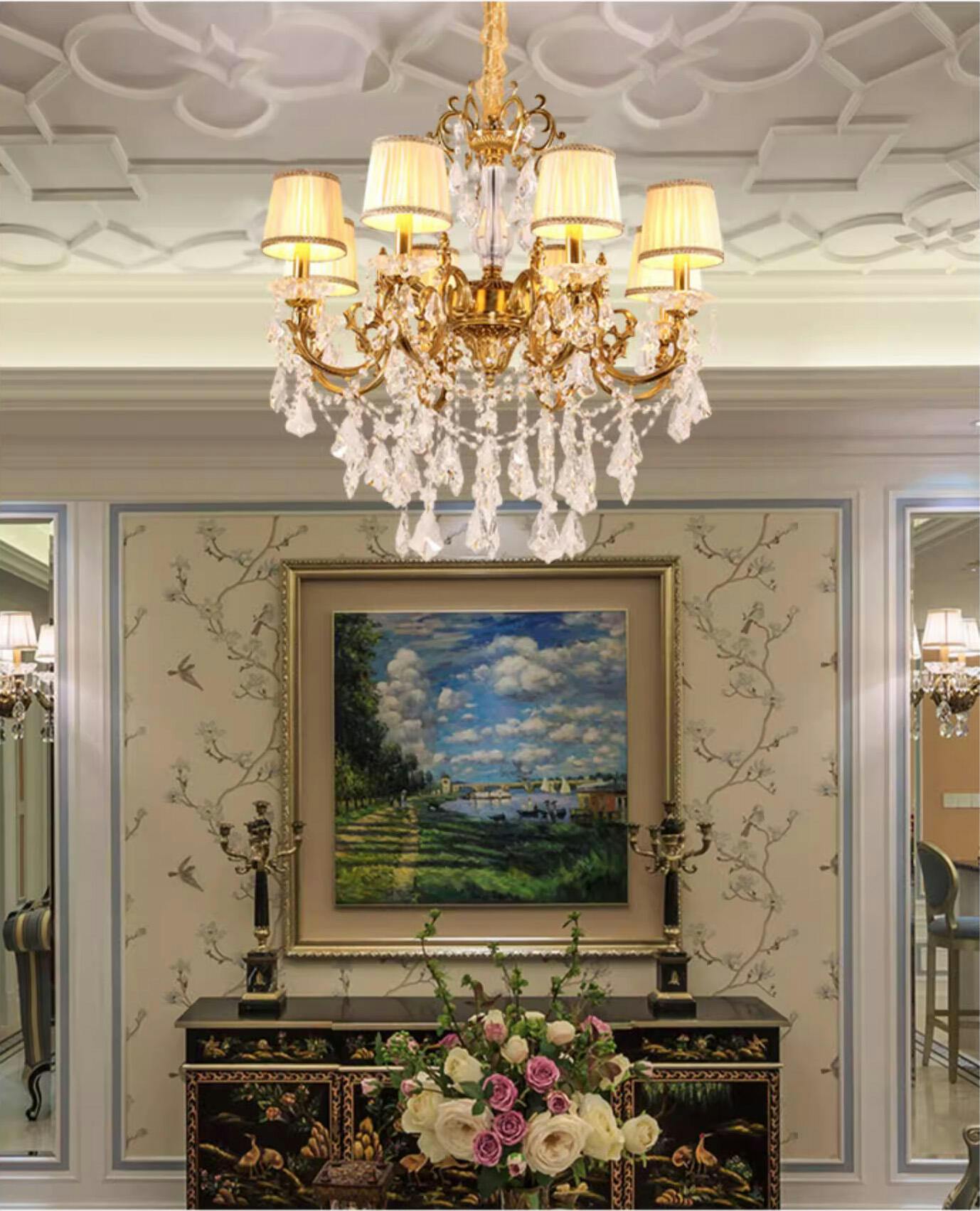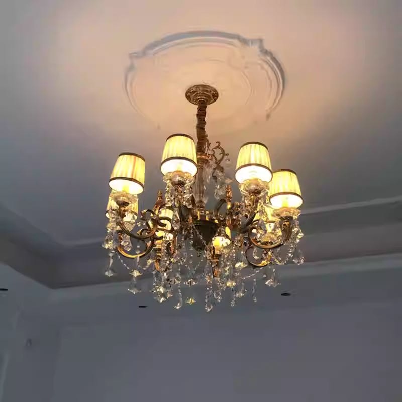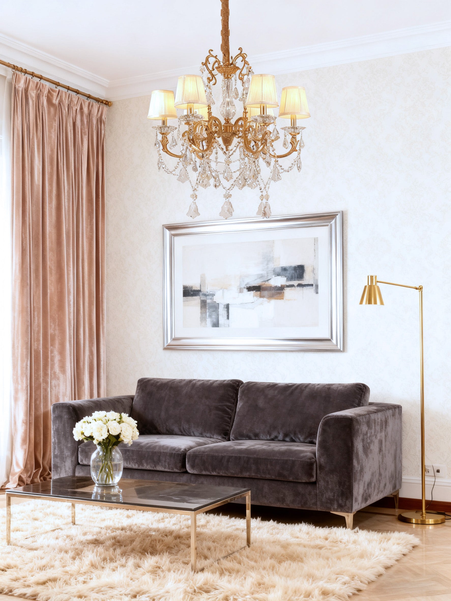 Adorn your entryway or dining room with a touch of timeless elegance. This enchanting 6-light chandelier features a gleaming antique brass frame with sweeping arms. Each arm gracefully supports a classic fabric shade, casting a warm and inviting glow. Cascading crystals throughout the frame add a touch of sparkle and brilliance. This 28-inch wide and 28-inch high chandelier is perfect for creating a sophisticated ambiance in medium-sized spaces.