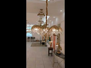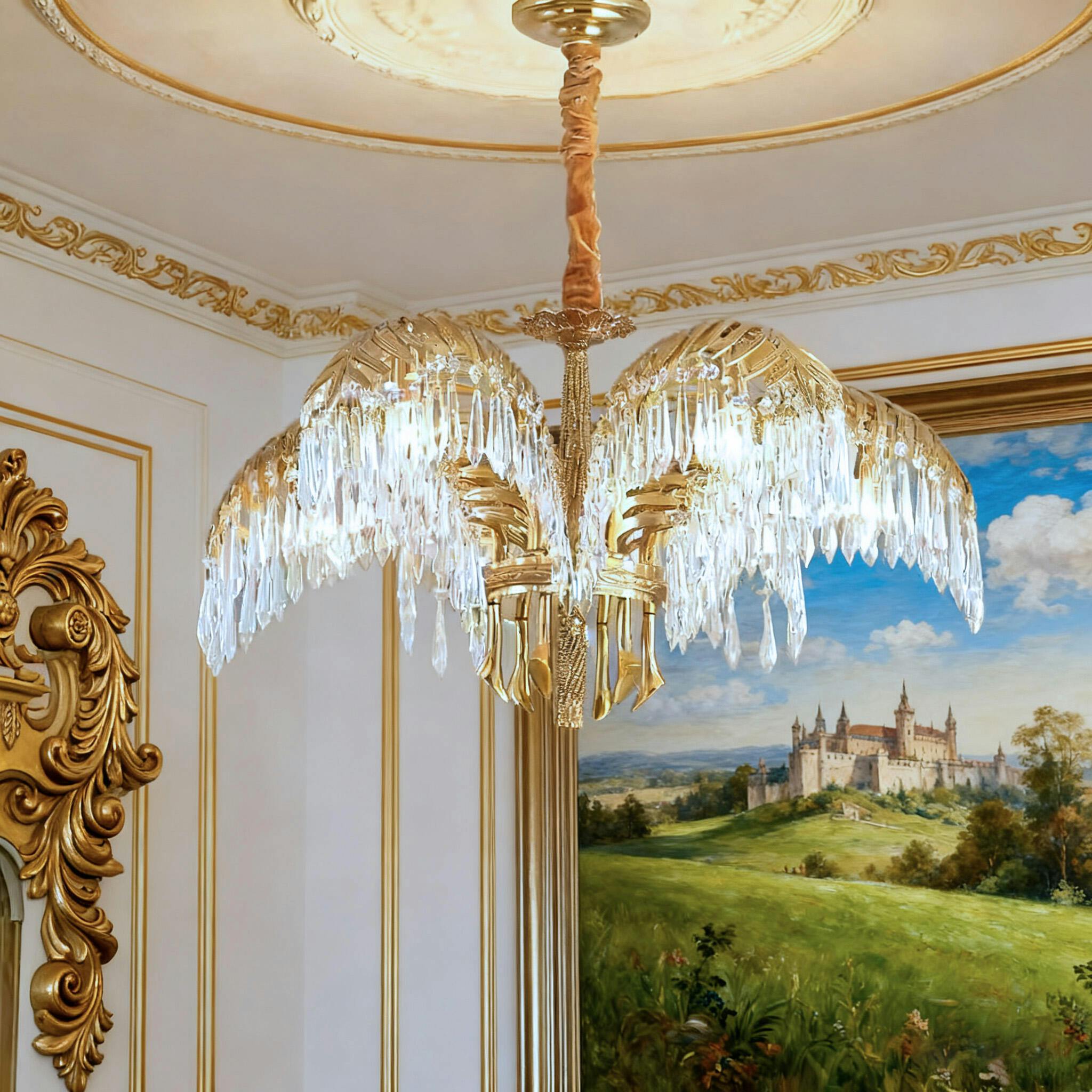 The palm tree brass chandelier, a luxurious fusion of elegance and whimsy, measures 30'' wide and 17'' high. Adorned with high-quality crystal and crafted from copper, it exudes opulence. With 6 dimmable LED lights, it casts a soft, adjustable glow, creating a captivating ambiance. This gold chandelier is a stunning addition to any space, seamlessly combining luxurious materials with a touch of playful sophistication.