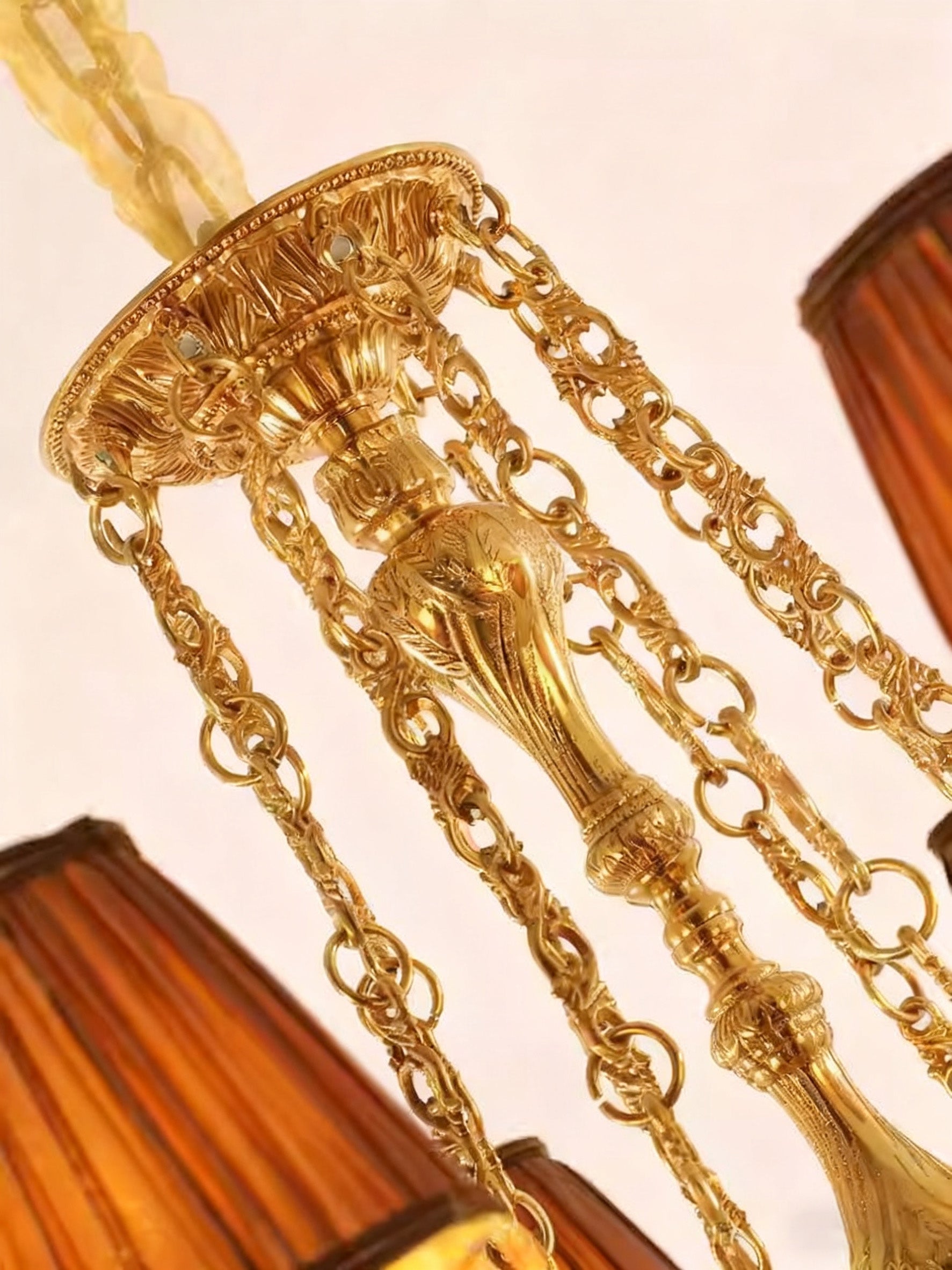The antique brass baroque chandelier is a captivating copper chandelier, 30'' wide and 30'' high, featuring 6 lights with lampshades. Crafted from high-quality brass, its intricate design and warm copper finish make it a perfect fit for intimate spaces like dining rooms or foyers. The chandelier's ornate details and graceful curves add a touch of old-world charm to any room.