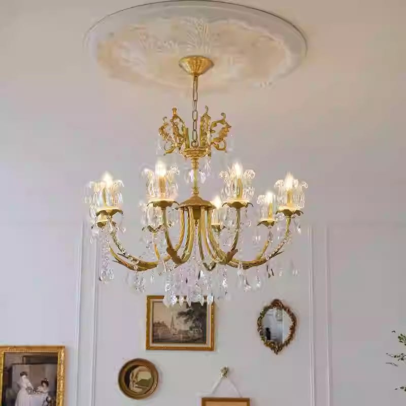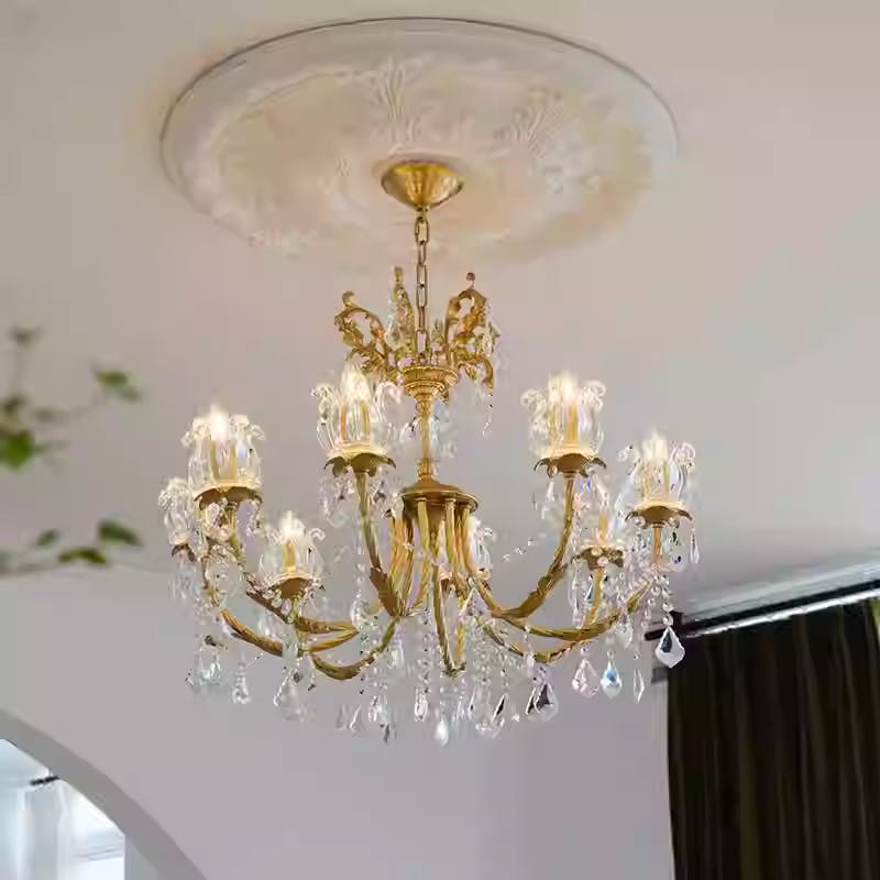 We've always wanted to create a "retro and exquisite" dining atmosphere in our 15㎡ dining room, and this 31-inch-wide, 27-inch-high brass crystal chandelier is simply the finishing touch! The retro hue of the brass matches the dark wood dining table perfectly. The warm light from the 8 candle-shaped lamps shines through the crystals, making the food look like a Michelin plating — even ordinary pasta seems to have an artistic feel. The crystal pendants refract tiny light spots under the light, and friends can't help but praise when they come for dinner: "This lamp in your dining room is so stylish, it's like bringing the elegance of old Europe here." The most surprising part is the details — the brass carvings are as delicate as artworks, and the crystal cutting is also very uniform. It leaves no traces even after wiping several times. Now every meal, the atmosphere created by the light makes eating a pleasure. This lamp is really the right choice~