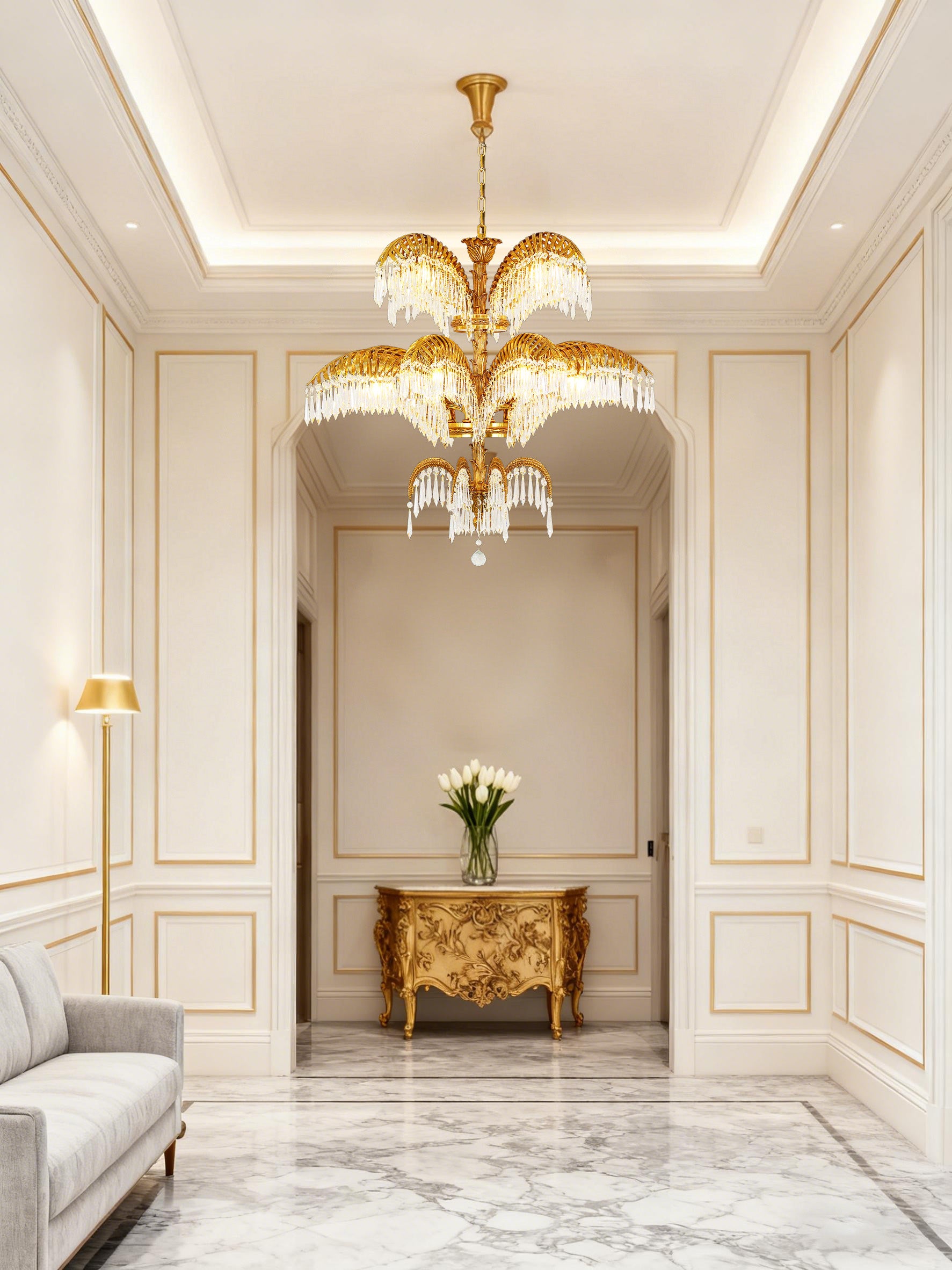 Introducing the magnificent palm tree chandelier, a 39'' wide and 35'' high masterpiece that boasts three layers of exquisite design. This opulent creation seamlessly fuses the allure of a copper chandelier with the sophistication of a crystal chandelier, exuding an air of luxury and grandeur. Its golden palm tree motif makes it a perfect fit for grand spaces such as foyers, entrances, and living rooms, adding a regal touch to any room. Crafted from copper and crystal, this chandelier is a true statement piece.m.