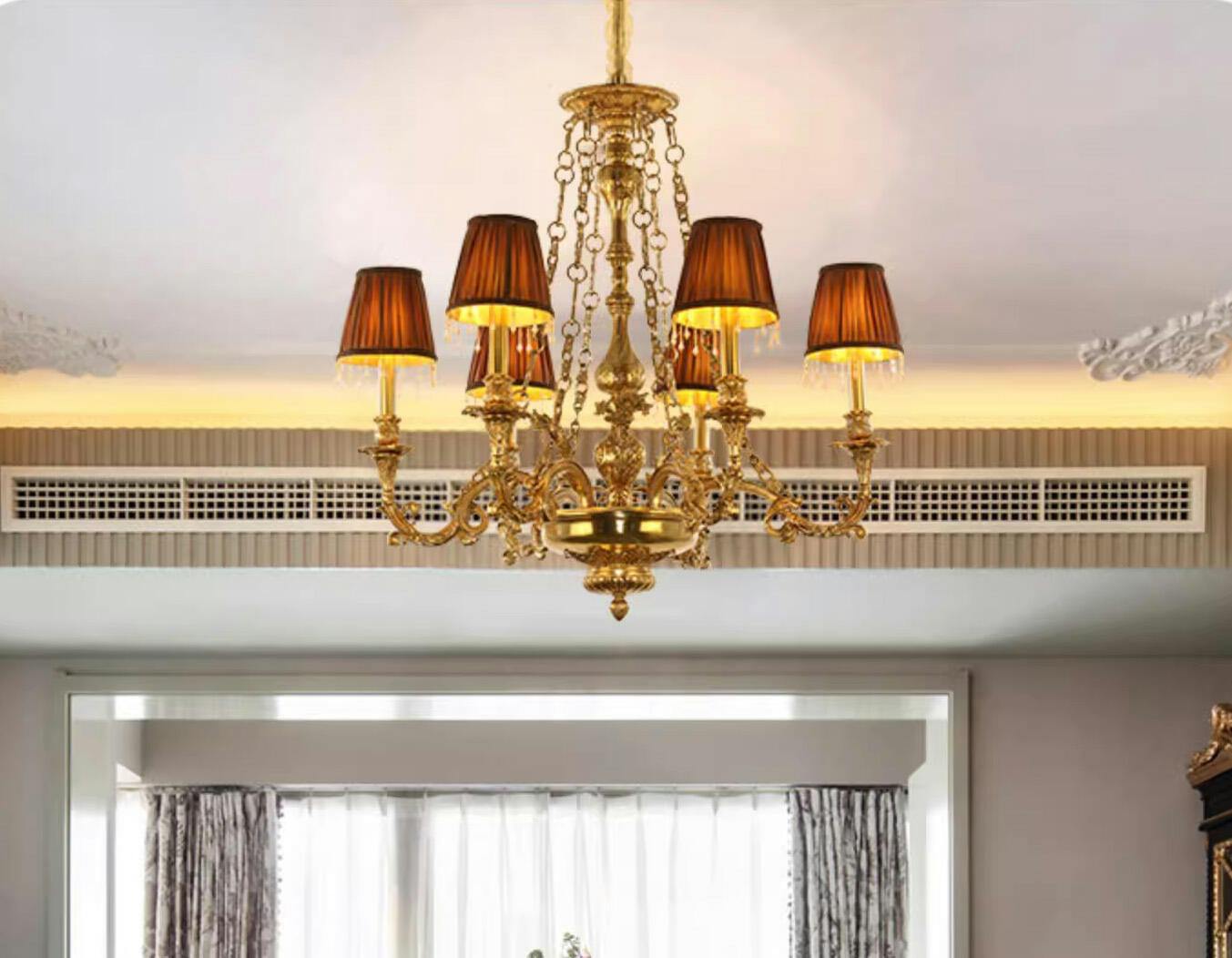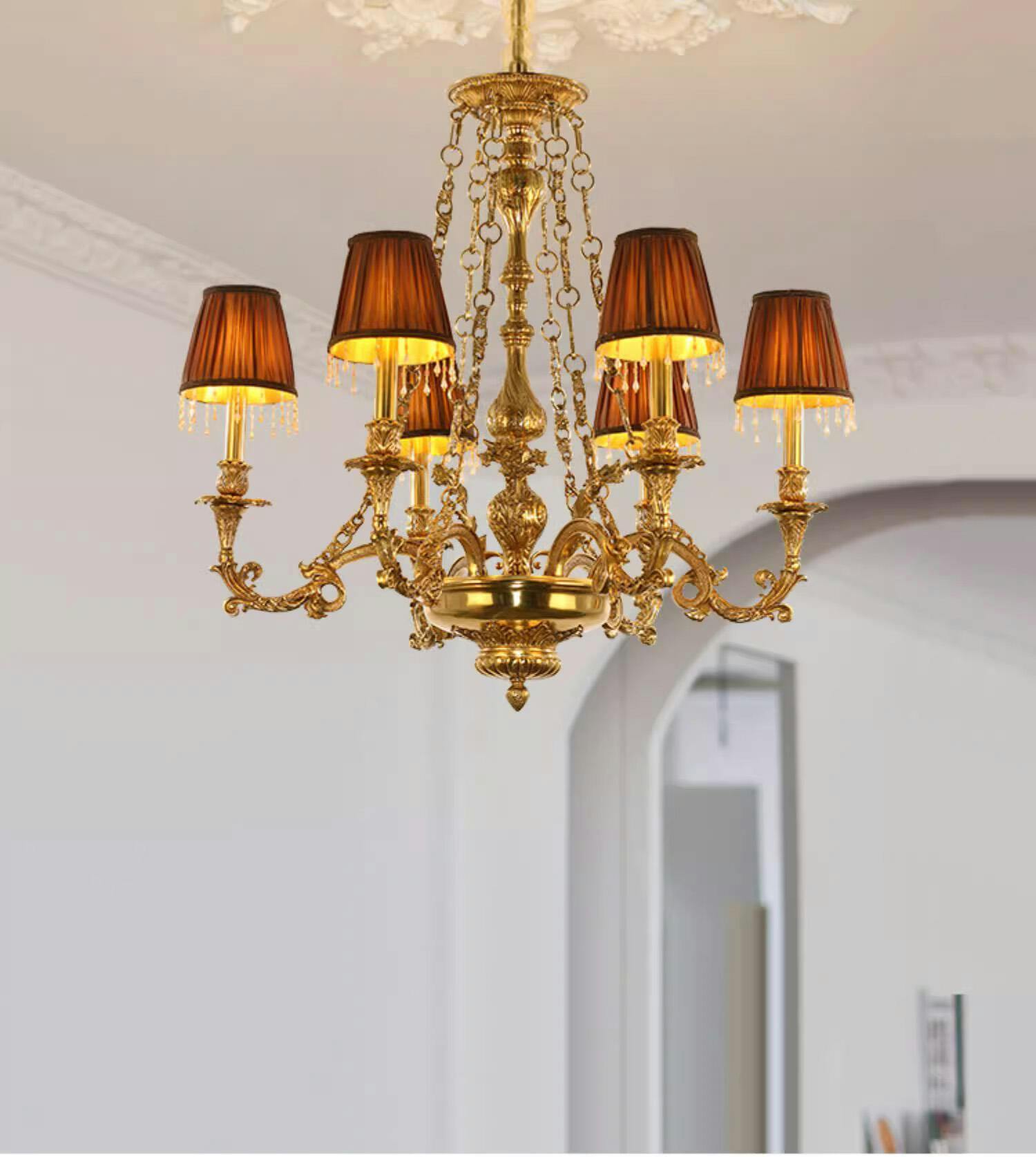 The antique brass baroque chandelier is a striking copper chandelier, 35'' wide and 30'' high, featuring 8 lights with lampshades. Meticulously crafted from high-quality brass, its intricate design and warm copper finish make it an ideal choice for grand spaces like dining rooms or entryways. The chandelier's ornate details and elegant contours bring a timeless allure to any setting.