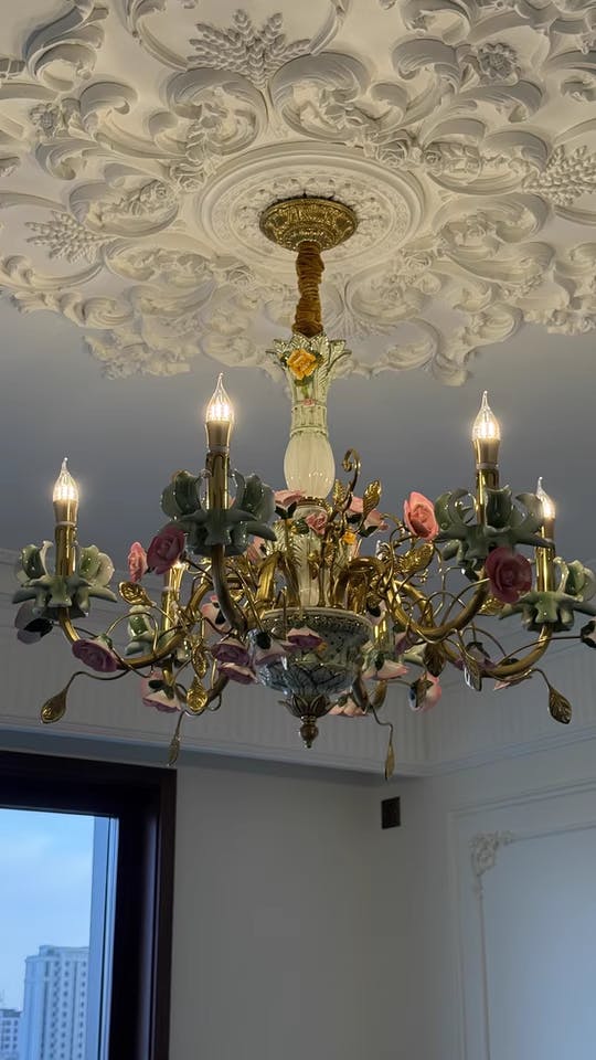 Our 15㎡ bedroom has a "soft and retro style". The previous lamp was too ordinary, but after replacing it with this brass chandelier with porcelain flowers, the whole room feels enchanted! The 39-inch width hangs right above the solid wood bed, and the 28-inch height makes the light soft and not glaring. The brass branches and leaves wrap around the pink roses, and when the warm light is on, the bedroom instantly has the romantic feel of a "French boudoir". When reading in bed before going to sleep at night, the light becomes especially gentle through the porcelain flowers, making even sleepless nights feel reassuring. What touches us most is the detail: the texture of the porcelain flowers is clear, the color transition of the petals is natural, and the brass part does not oxidize or darken. Now the bedroom has become the most relaxing place in the house. Every time we lie in bed and look at the lamp, we feel, "This is truly our own little world."
