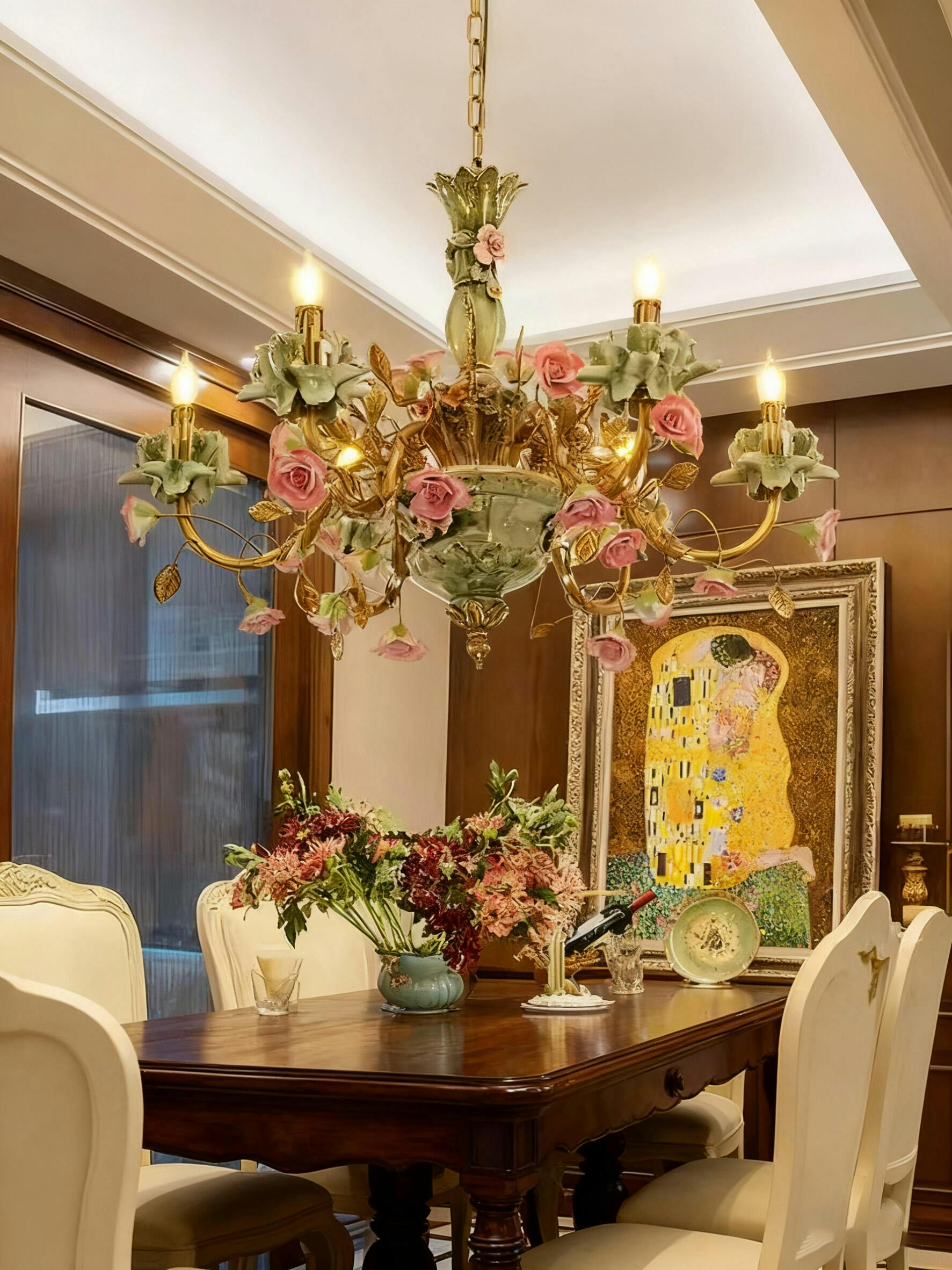 39X28 Inch 10 Lights Brass Chandelier and Green & Pink Porcelain Flower Chandelier
