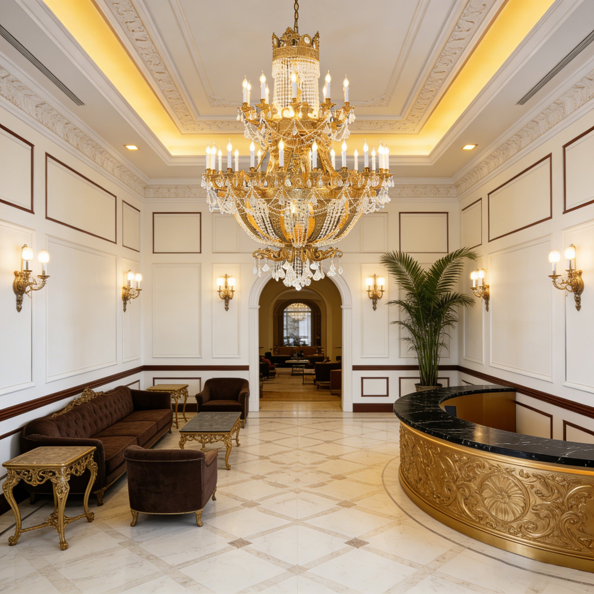 The French Empire crystal chandelier is a grand foyer lighting fixture made of brass and crystal, boasting 42 lights and measuring 51'' wide and 67'' high. Its opulent design and intricate crystal details make it a captivating addition to any grand entrance or foyer. The chandelier's exquisite craftsmanship and timeless allure infuse the space with a sense of luxury and grandeur, creating a stunning focal point that welcomes guests with elegance and sophistication.