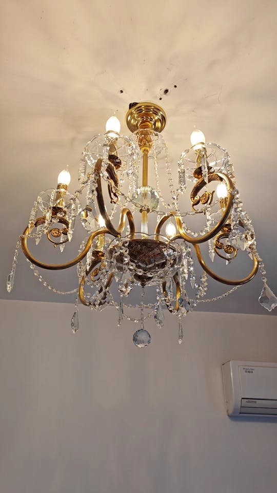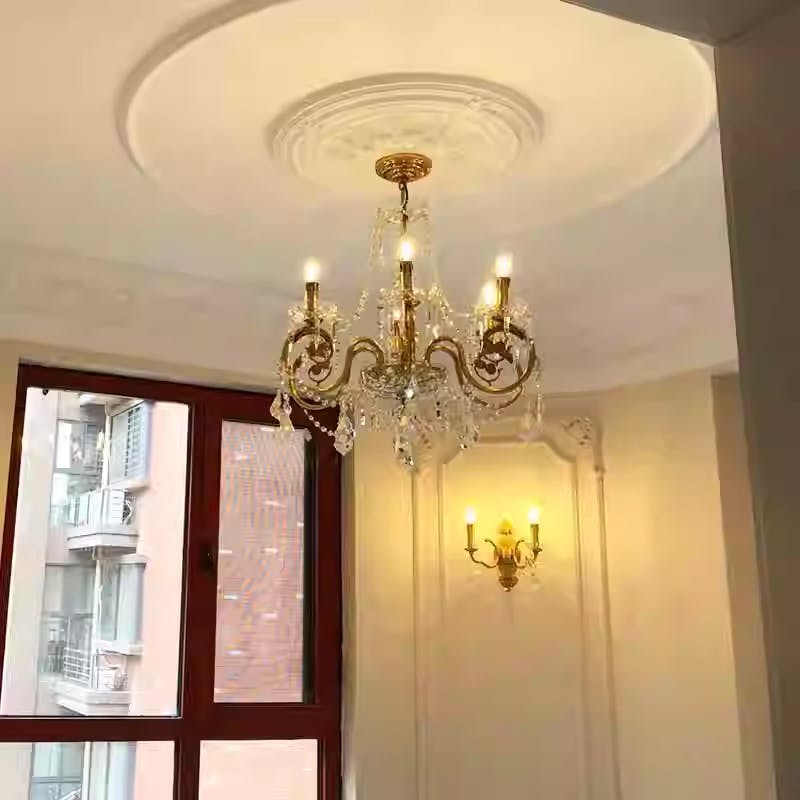 We wanted to create a "retro and healing" corner in our 15㎡ bedroom, and this classical chandelier is really the right choice! The 25×27-inch size hangs above the lounge area by the window. The warm tone of antique brass matches the linen curtains and rattan chair very well. The light from the 6 candle-shaped lamps becomes soft and dreamy through the crystals. When the afternoon sun shines obliquely, the light spots refracted by the crystals sway on the wall, like the light spots we chased when we were kids — we can stay there reading for an afternoon. When the light is dimmed at night, the entire lounge area feels wrapped in tulle. The warm light isn't glaring, and even sleepless nights become reassuring because of this soft light. What touches me most is the detail: the carvings on the lamp arms are as delicate as jewelry, and the crystals still sparkle faintly in the moonlight. Now this corner has become the favorite place in the bedroom, and every time we stay there, we feel "life is so gentle".