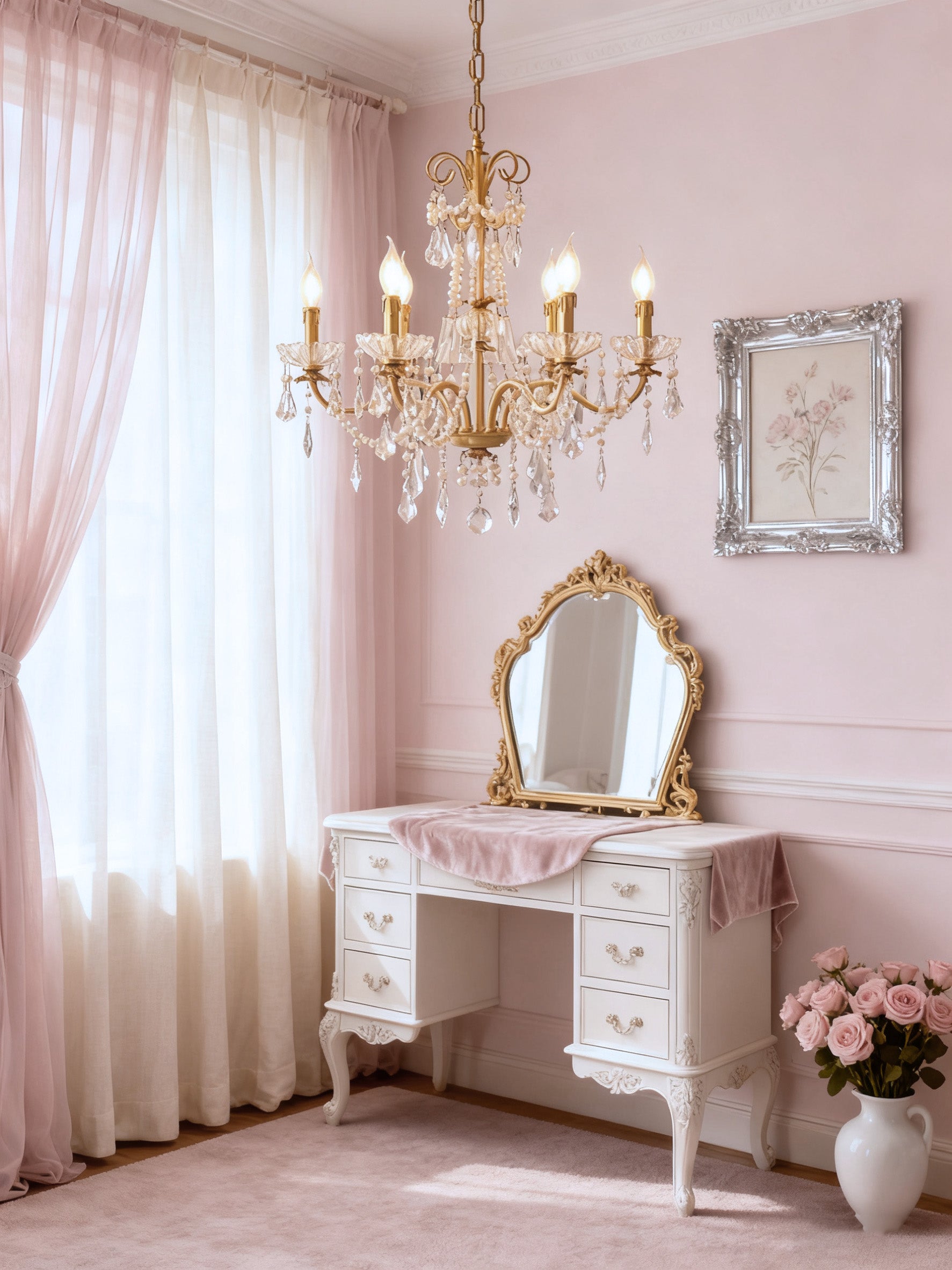 This charming 6-light chandelier brings a touch of vintage elegance to any space. Its antique brass finish adds warmth, while the cascading acrylic pearl chains create a soft, romantic glow. Measuring 25.5 inches wide and 24 inches high, this chandelier is ideal for entryways, hallways, and smaller dining rooms.