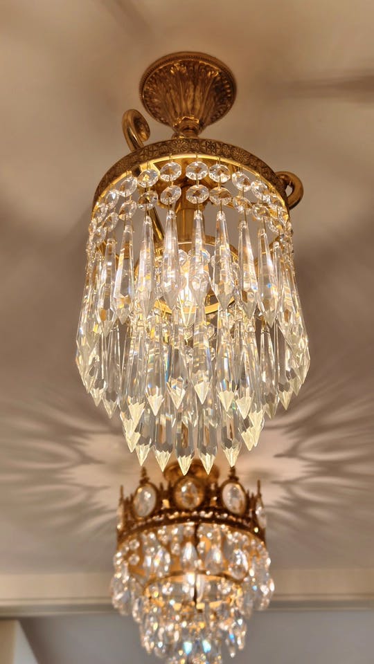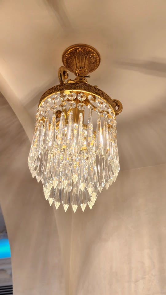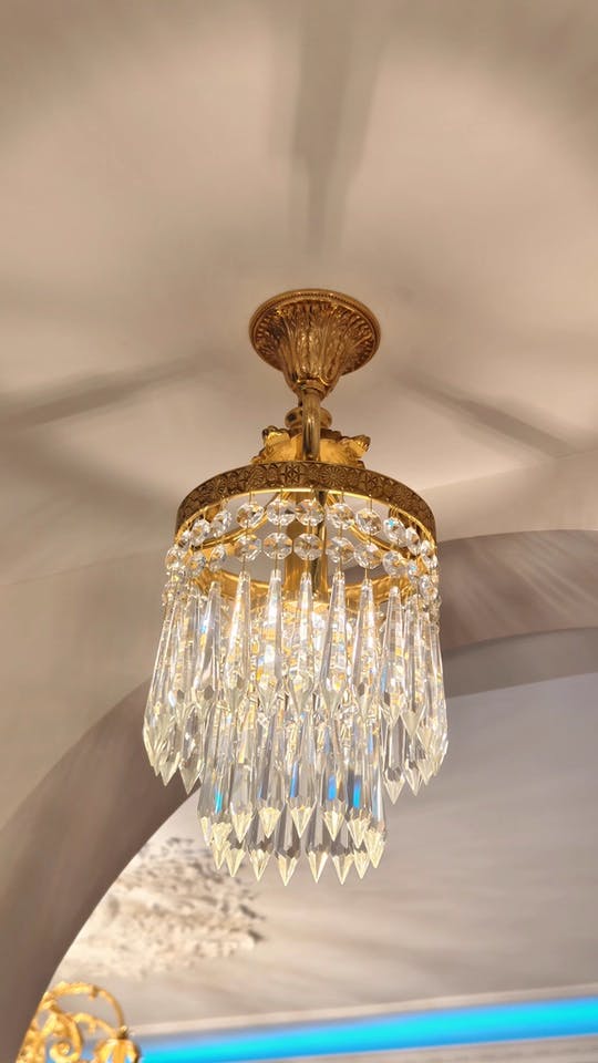 Dazzle your entryway or foyer with this glamorous mini chandelier. Crafted from gleaming antique brass, this 8-inch wide fixture features a cascade of sparkling crystals that refract the light for a truly enchanting look. Perfect for adding a touch of elegance to smaller spaces, this chandelier is also ideal for hallways, powder rooms, or even above a breakfast nook.