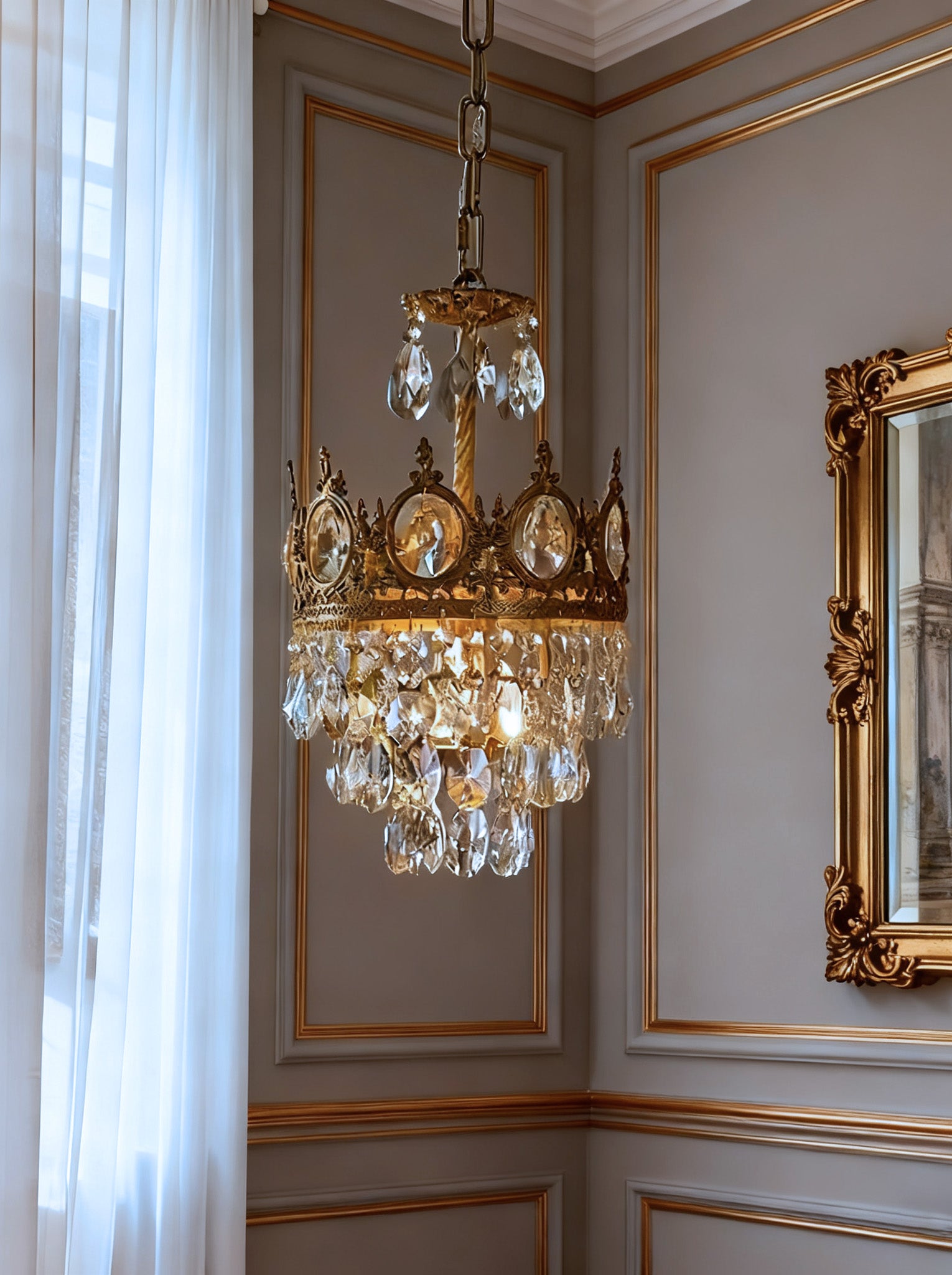 Looking for a lamp for our 20㎡ light-luxury small living room that "doesn't overwhelm the ceiling height yet can be a highlight", this 9×17-inch mini crystal chandelier exceeded expectations! The Empire-style brass frame looks like a miniature court decoration, and the crystal pendants hang like a light waterfall; when warm light is on, light refracts flowing spots on the wall through the crystals, giving the small living room an instant "condensed sense of luxury". It hangs above the sofa area, neither blocking the view nor failing to form a "retro × modern" style dialogue with the mid-century side table. After a month of use, the crystals are still as transparent as new, and the brass has no oxidation traces. Friends all praise, "The small living room is so stylish — this lamp is essential" — choosing it for a small space truly "reveals grandeur in the small".