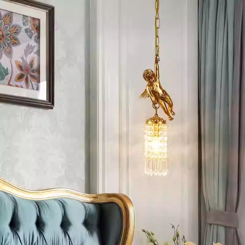 The 7'' wide, 6'' high copper chandelier pendant light is a captivating blend of elegance and charm. Crafted from cast copper and high-quality crystal, it features a single light that casts a mesmerizing glow. The intricate design, featuring a copper angel and crystal, adds a touch of whimsy and sophistication to any space. This pendant light is a perfect choice for those seeking a unique and enchanting lighting fixture.