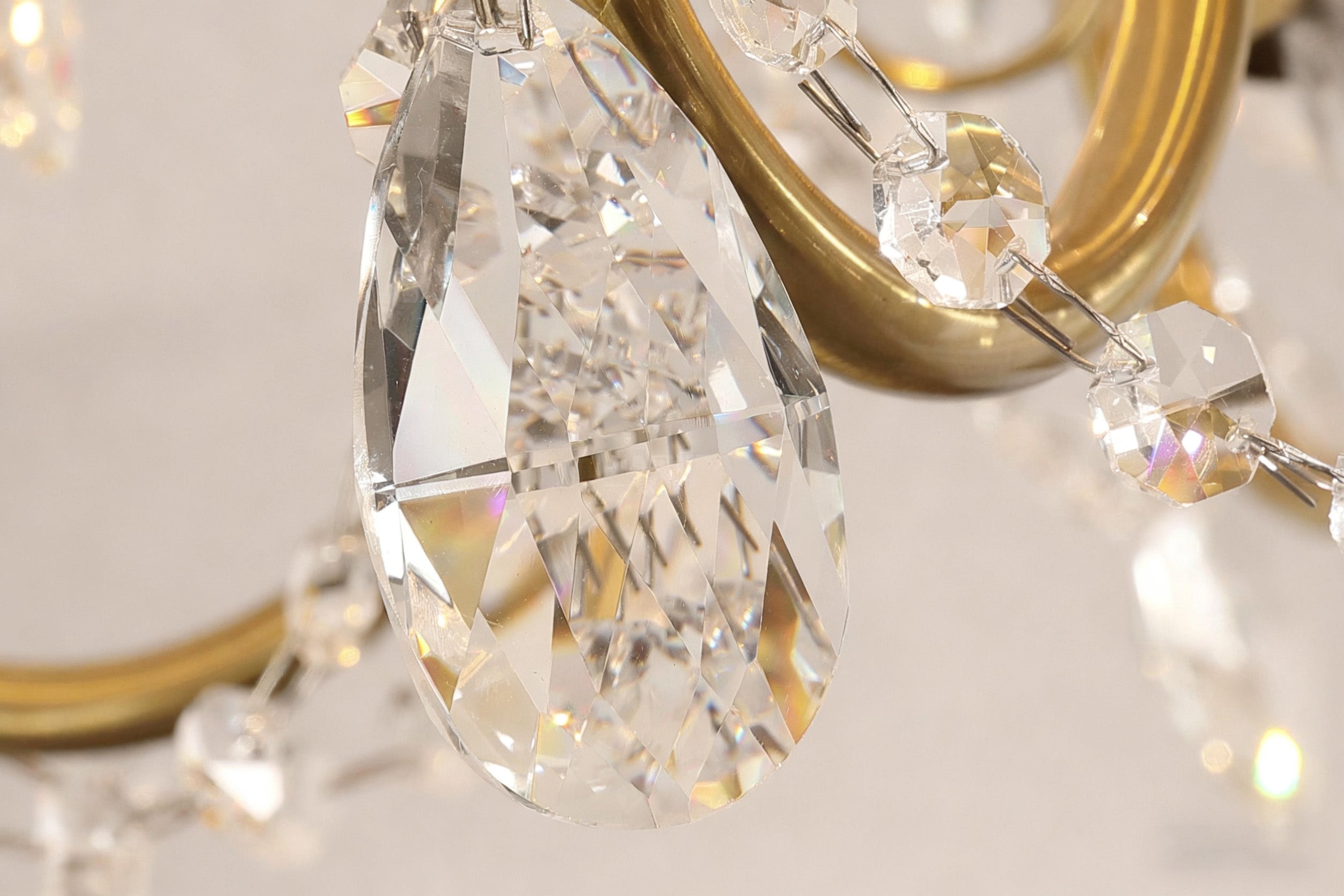 This elegant 26 inch wide by 26 inch high classical chandelier features a gleaming brass frame with six gracefully curving arms. Each arm holds sparkling high quality crystals that refract light beautifully. The chandelier's compact size makes it ideal for foyers, hallways, or smaller dining rooms, adding a touch of timeless glamour to any space.