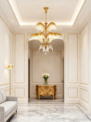 30 Inch Wide 2-Layer Palm Tree Brass and Crystal Chandelier Light
