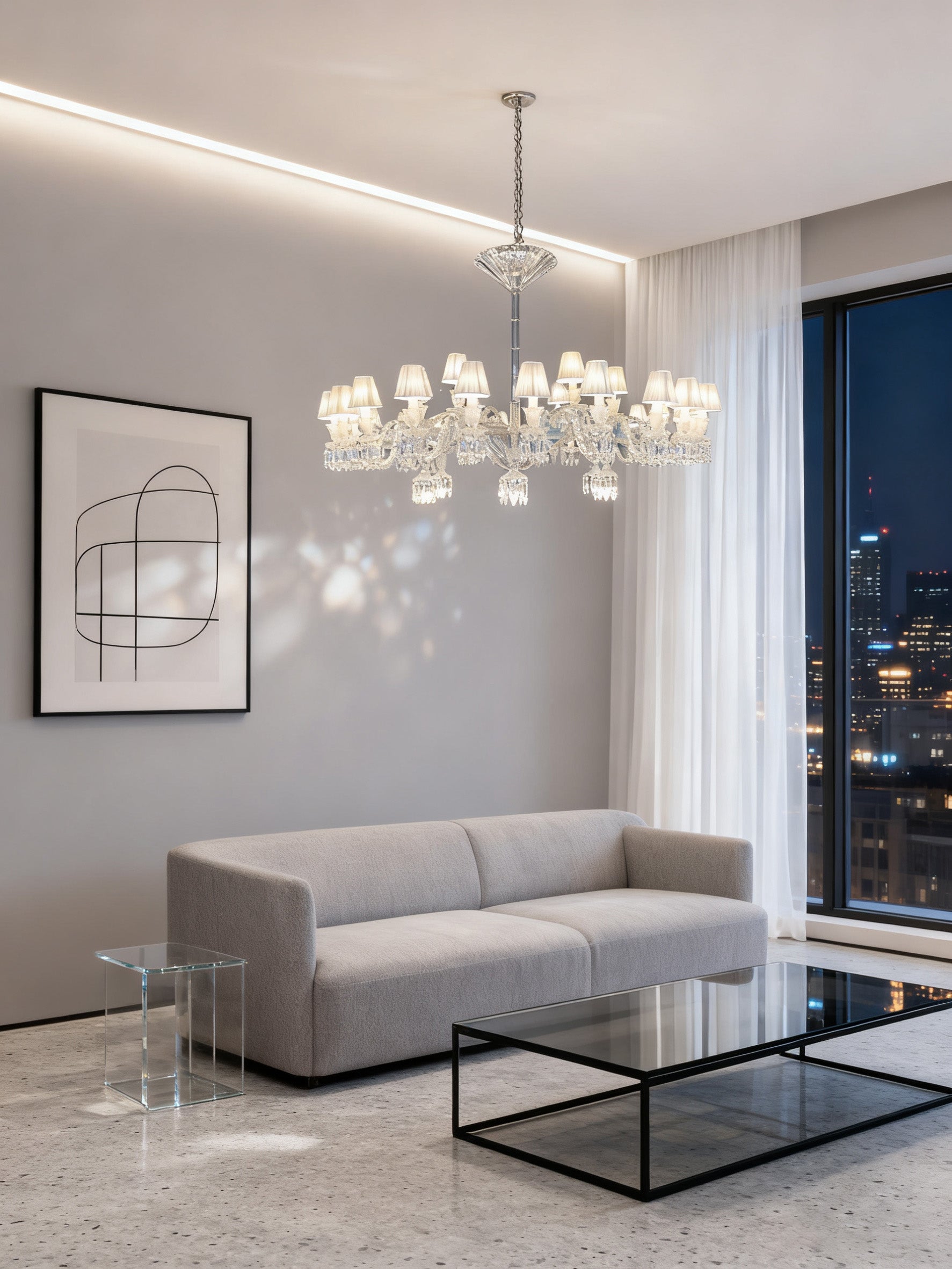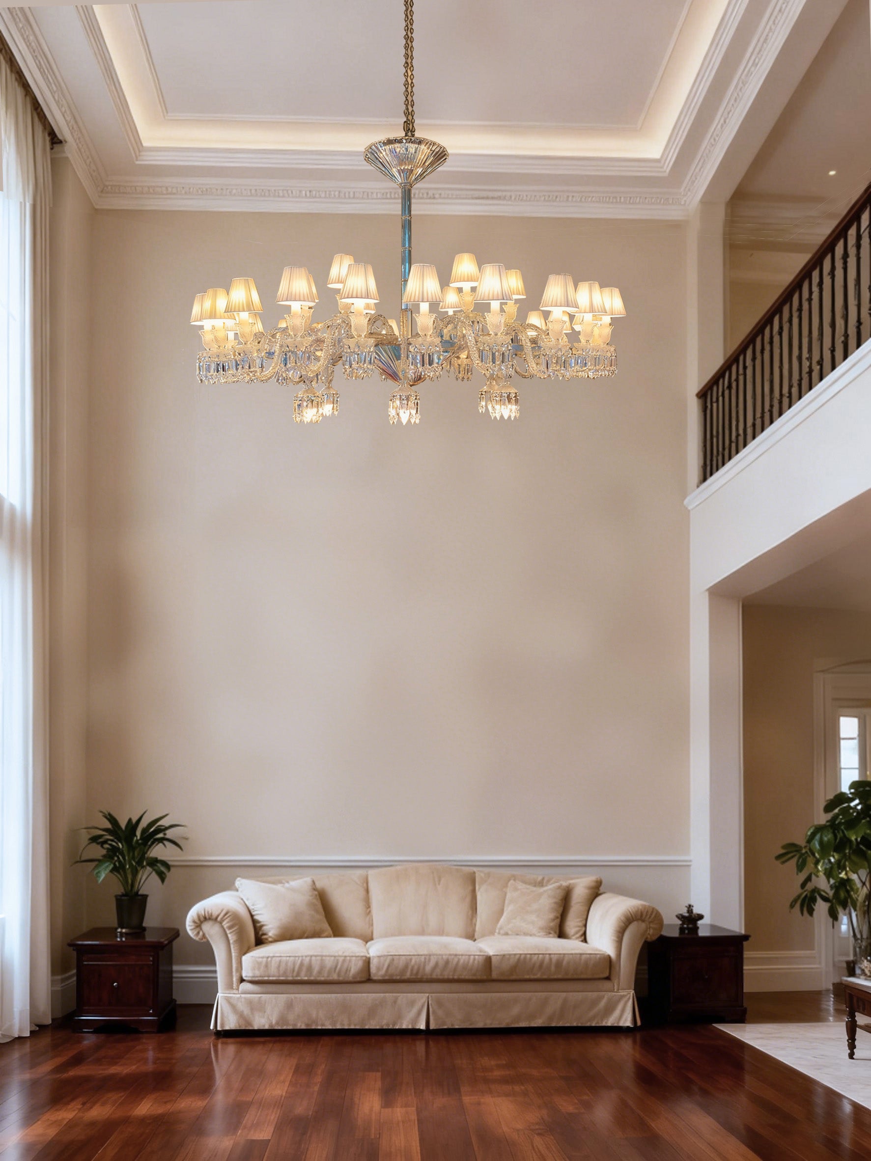 Our 25㎡ living room always felt "cozy but lacked a highlight" before. After installing this all-clear crystal chandelier, friends all say "it's like moving an art gallery into the home"! Its 180cm width perfectly supports the openness of the living room without being obtrusive; when 36 warm lights filter through the pure white lampshades and crystals, the entire space is wrapped like a "soft light filter", and the beige fabric sofa and solid wood coffee table gain a touch of "exquisiteness" because of this light.