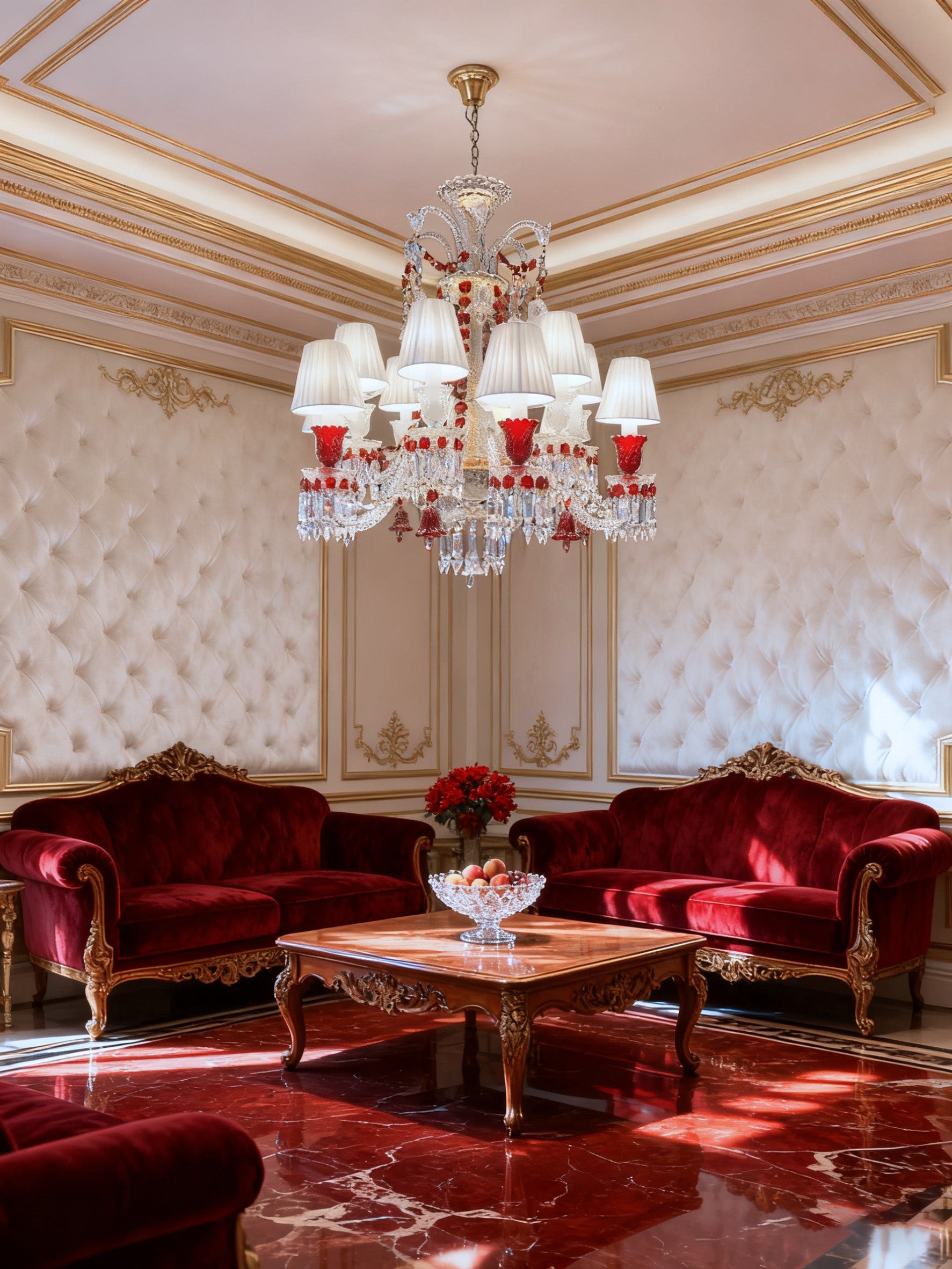 The Clear & Red Baccarat Crystal Chandelier in Gold is a stunning baccarat lighting fixture. With a width of 81cm and height of 84cm, it features 12 lights and a combination of clear and red crystals. This chandelier adds drama and sophistication to any space, becoming the focal point of the room. Its meticulous craftsmanship and timeless design make it a collector’s item. Whether installed in a dining room or a grand entrance, this chandelier exudes elegance and luxury. The harmonious arrangement of crystals reflects light beautifully, creating a mesmerizing visual display. It is a statement piece that adds glamour and opulence to any setting.