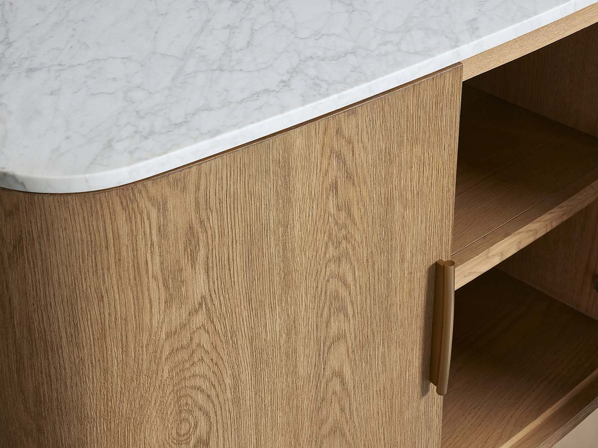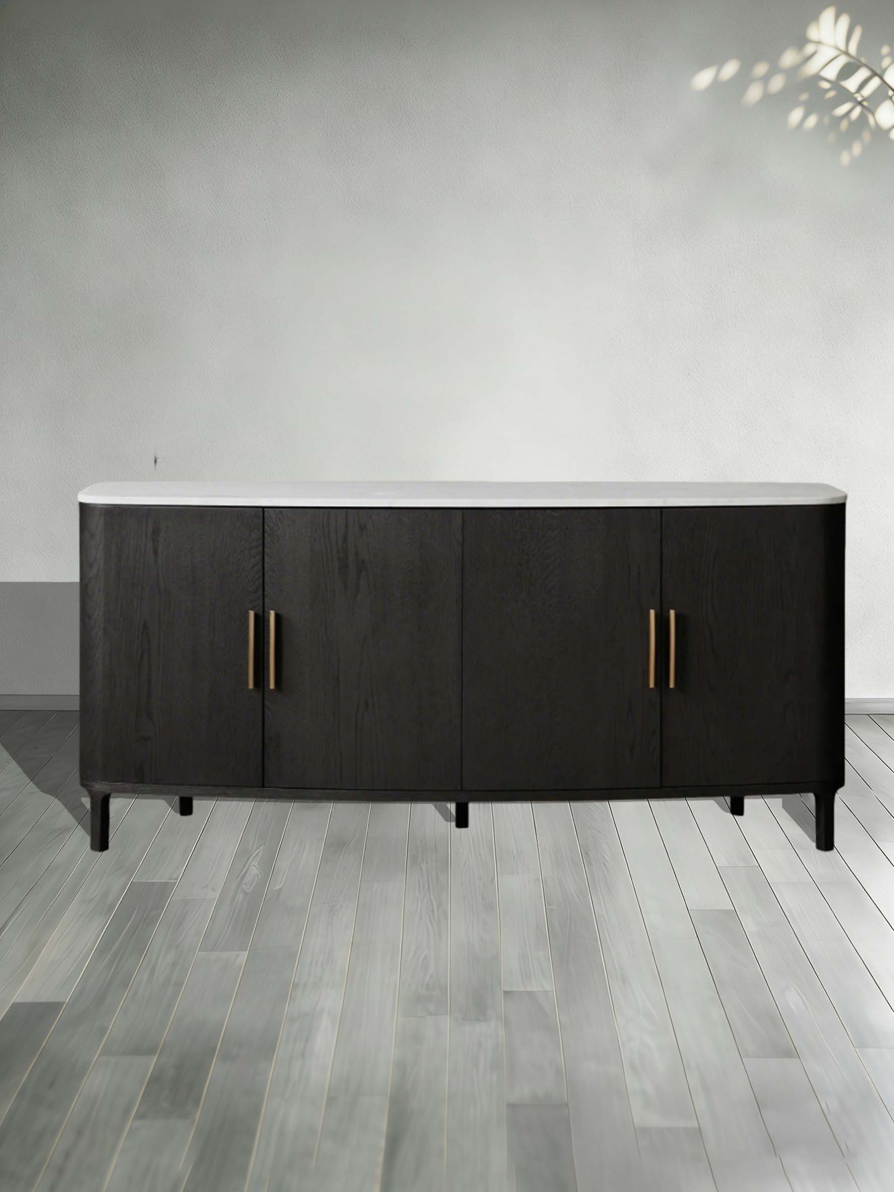 Expertly crafted from solid oak and available with a hand-applied ebony or fawn finish, this sideboard is topped with your choice of elegant white Carrara or earthy Royal Cream marble. Each marble surface is sealed with a clear lacquer to enhance its natural beauty and provide lasting protection.