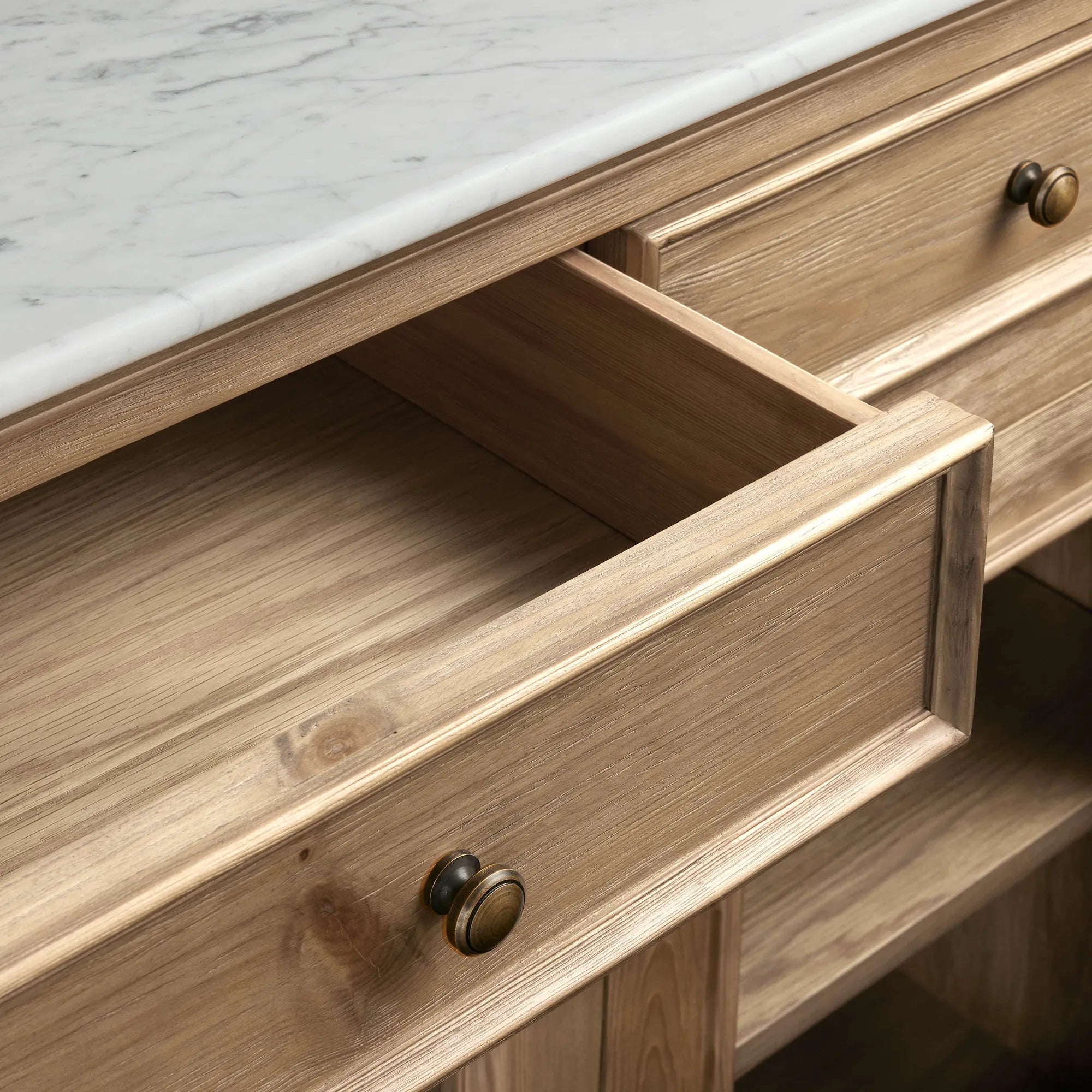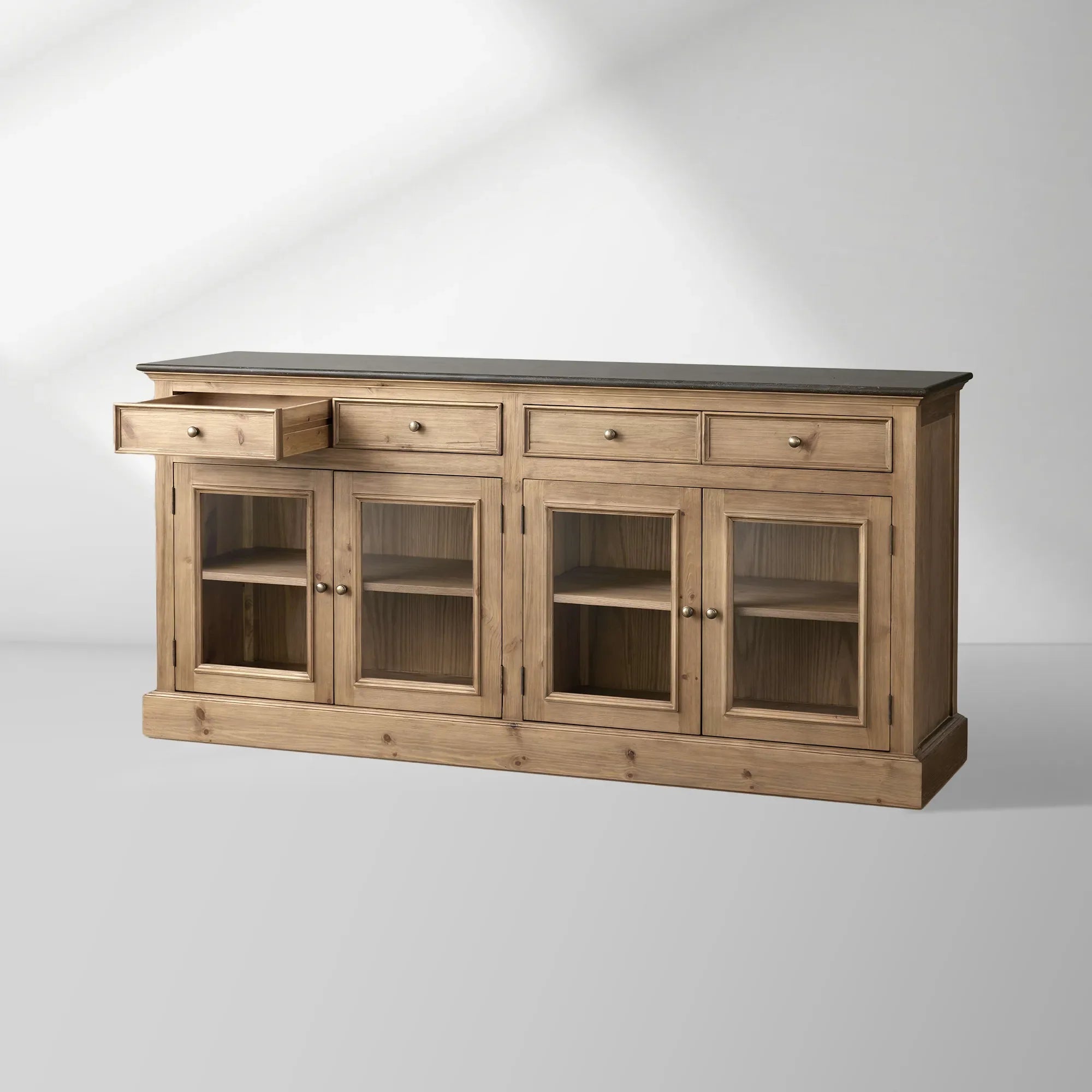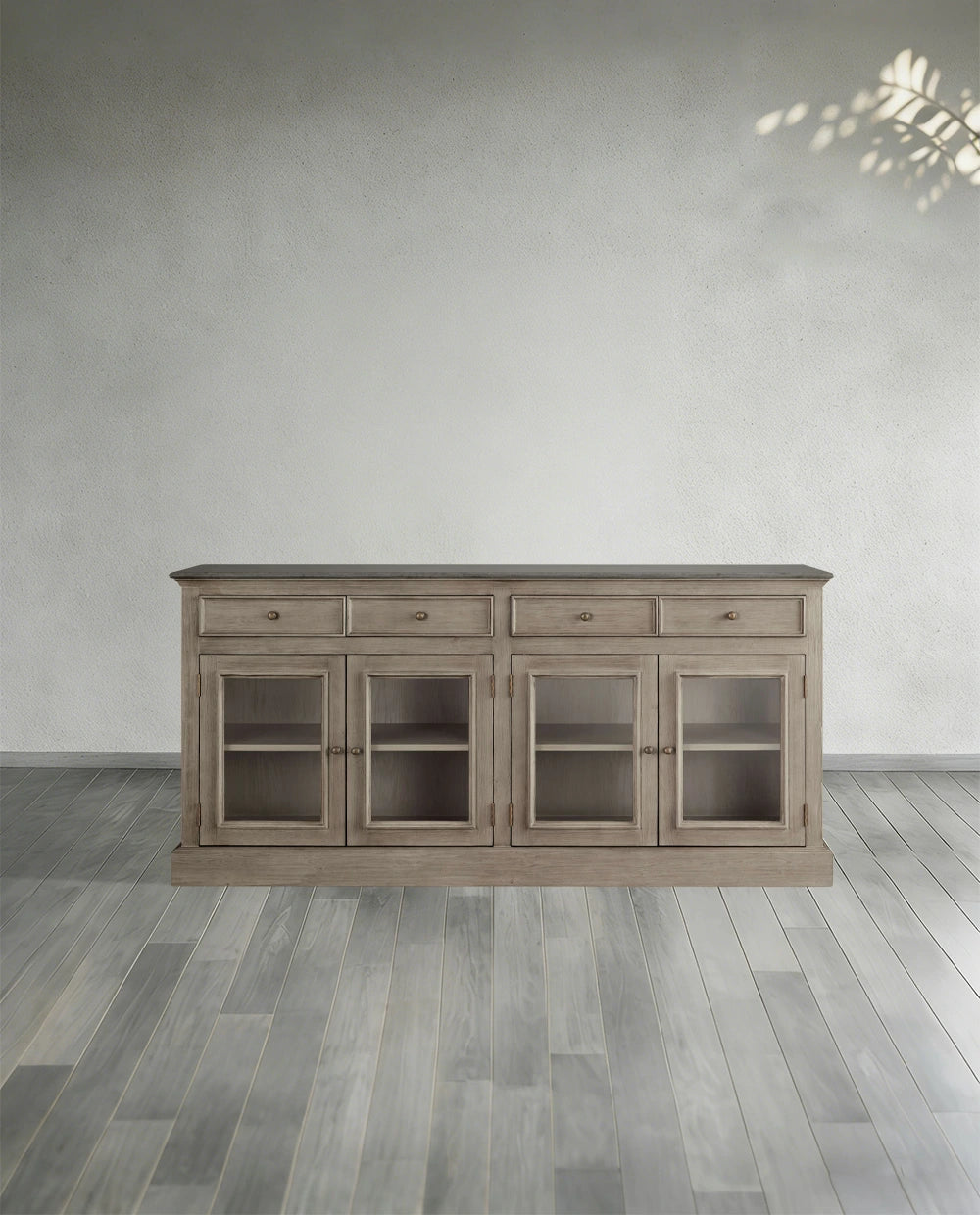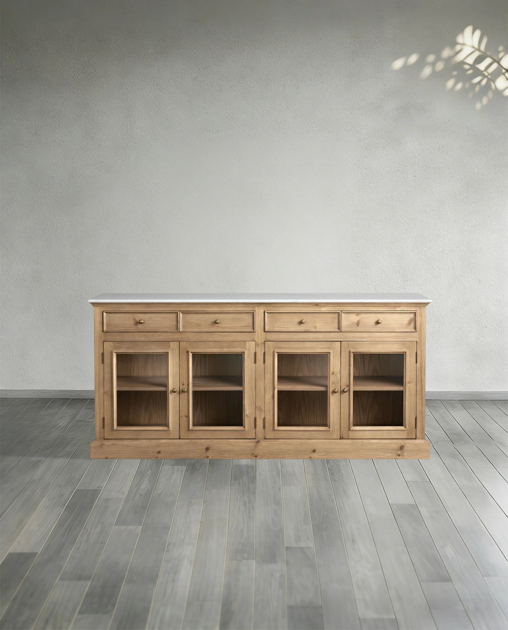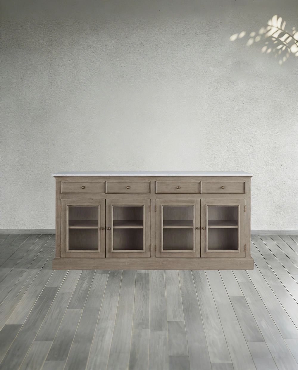 This sideboard combines three materials—marble, solid wood and glass—infusing spaces with light luxury sophistication and multifunctional storage value. Featuring a natural marble tabletop with unique veining, it’s wear-resistant and stain-proof; the solid wood cabinet paired with transparent glass doors facilitates displaying collections and tableware while offering closed dust-proof storage, combining display and storage functions. Suitable for dining rooms, living rooms, entryways and other scenarios, the reinforced cabinet is stable and durable, with a protected wood surface that’s easy to wipe and maintain. Its modern light luxury style complements light luxury, modern, American and other home aesthetics, perfectly balancing practicality and decorativeness.