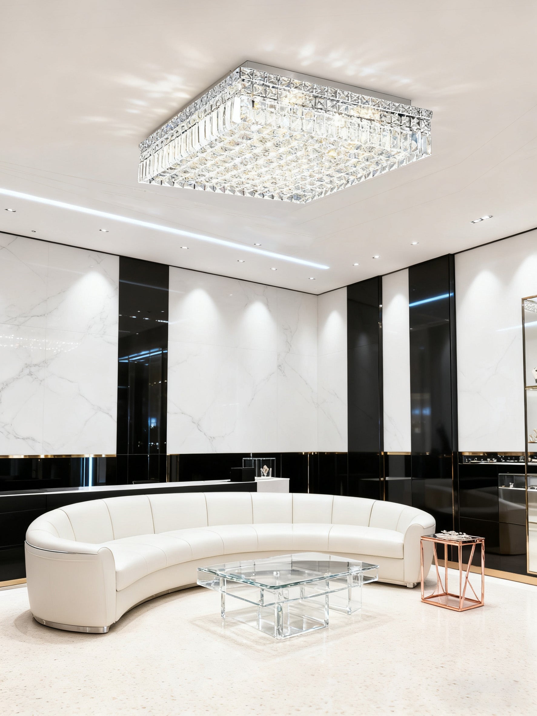 This crystal ceiling light offers a modern and sleek design, measuring 24'' square with flush-mounted installation. Its K9 crystal material generates a breathtaking visual - adding an elegant touch to any setting. Illuminate your space with this premium crystal light for a luxurious ambiance that leaves an unforgettable impression.