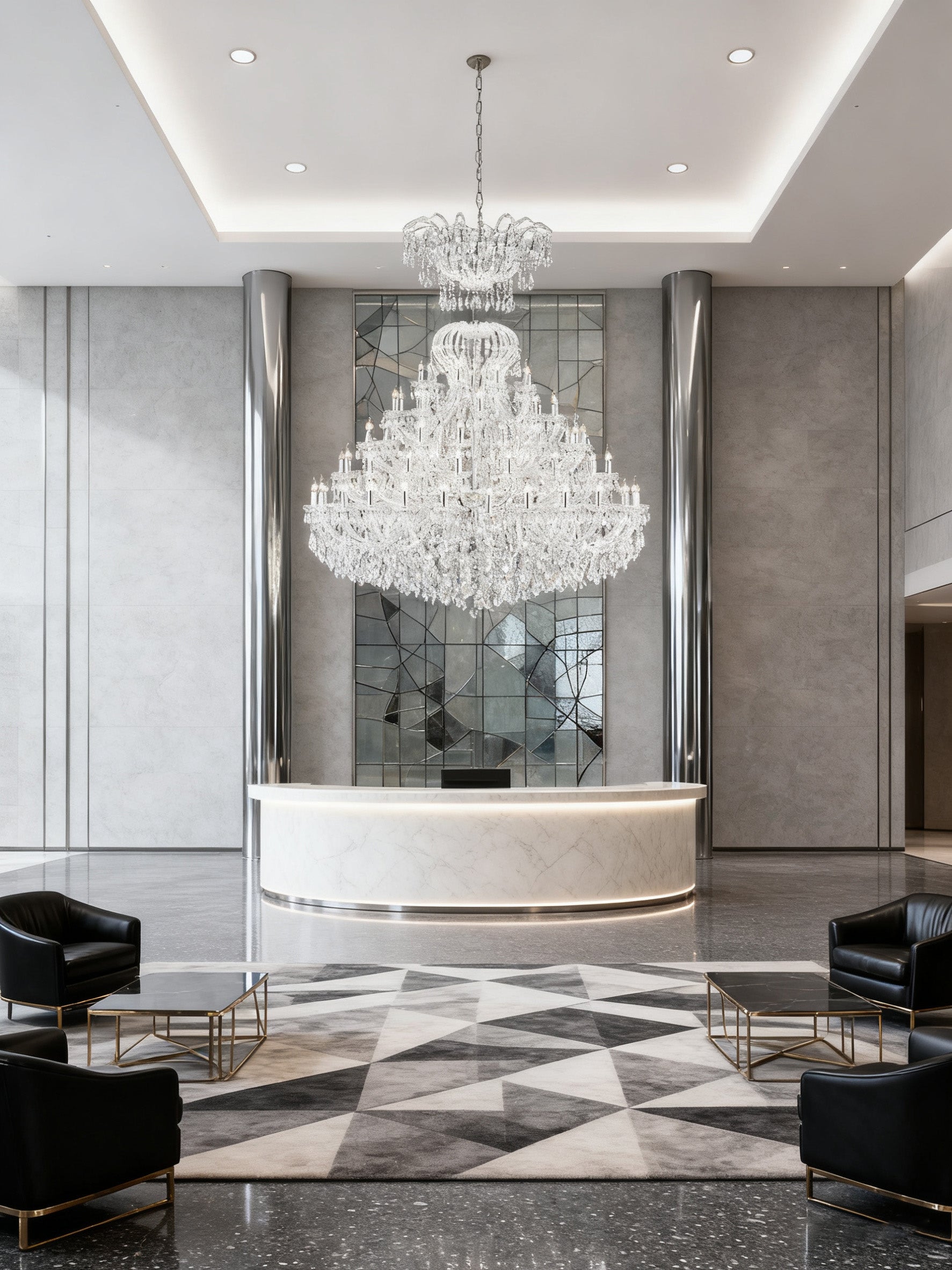 This magnificent lighting masterpiece commands attention with its impressive 210cm (83") height and 200cm (79") width, designed to illuminate expansive interiors. The polished chrome metal frame creates a luminous foundation for a precisely arranged 90-light configuration (27+18+18+9+9 layout), ensuring balanced illumination through cascading crystal and glass elements.