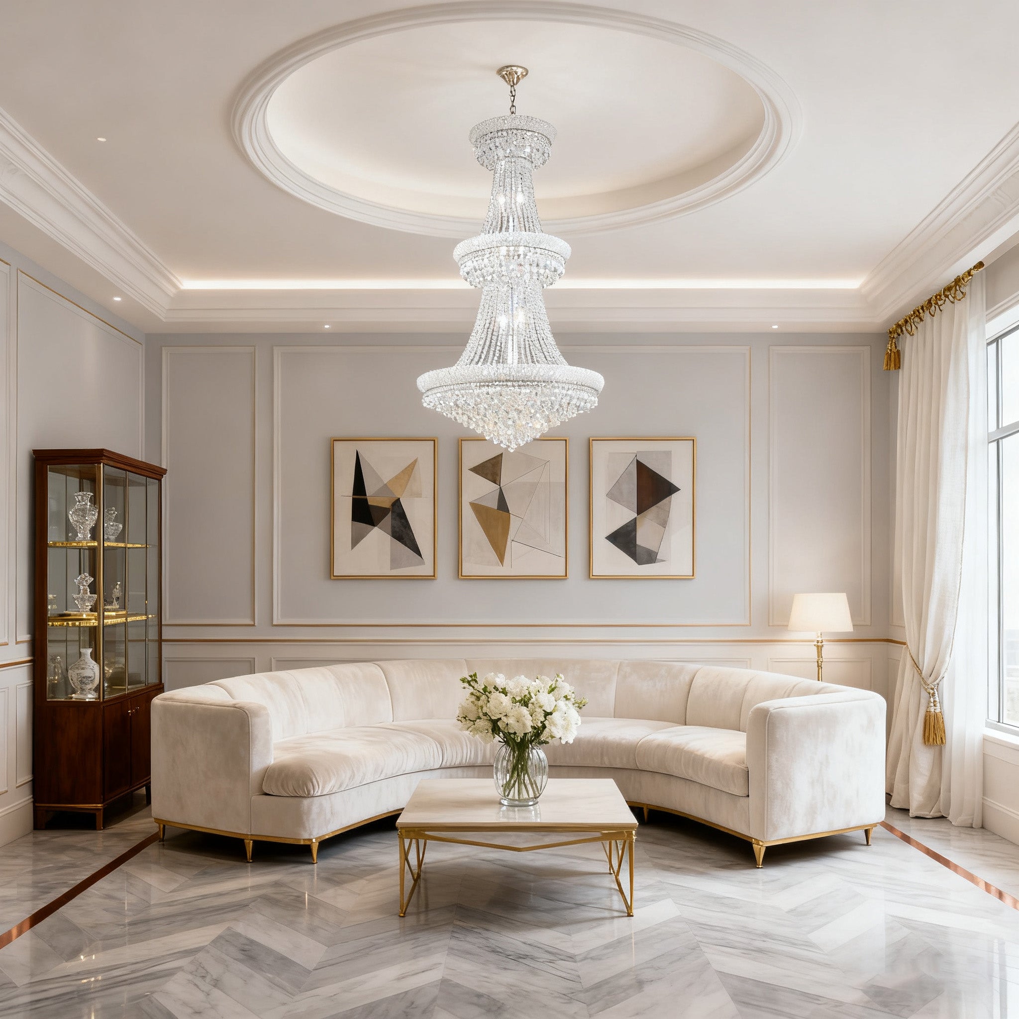 The empire crystal chandelier, with options in chrome and gold finishes, measures 36 inches wide and 66 inches high, radiating opulence and grandeur. Its intricate chandelier lighting design casts a radiant glow, making it a perfect fit for grand ballrooms, spacious foyers, or any area with lofty ceilings, adding a touch of luxury and sophistication to the space.