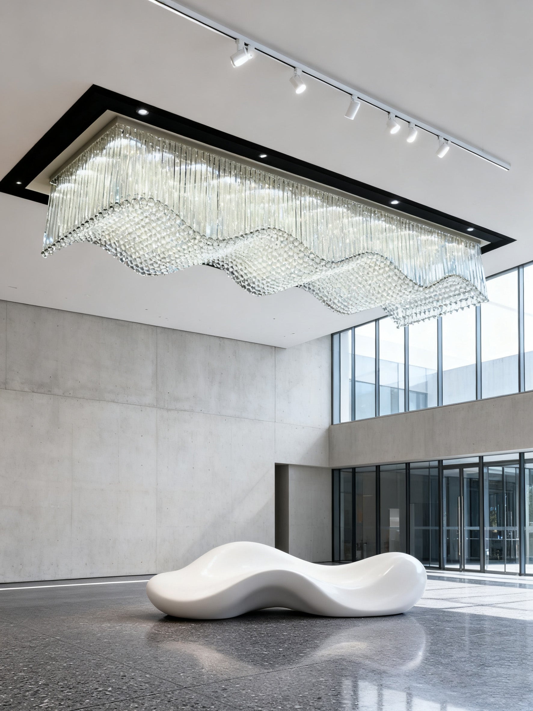 This oversized, flush mounted rectangle chandelier is a striking addition to any space. Crafted from chrome stainless steel, crystal, and glass, its wave-shaped design exudes modern elegance. With impressive dimensions of 36'' wide, 192'' long, and 20'' high, it's perfect for grand settings. Its size can be customized to fit any space, and its captivating design ensures it will be a focal point, adding a touch of luxury and sophistication to any environment.