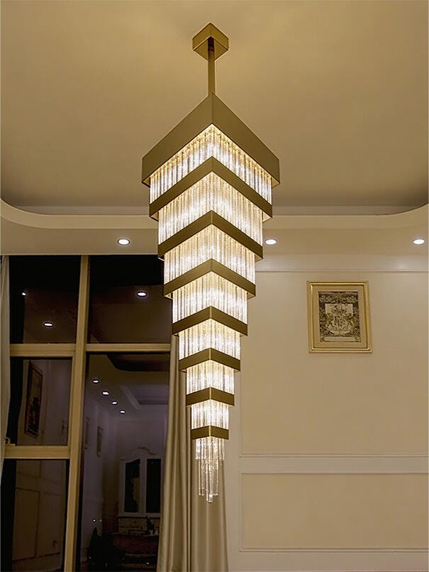 This luxurious 190cm (75") chandelier features 75 G9 bulbs illuminating cascading glass elements on a gold-plated metal frame. With a symmetrical 106cm (42") square profile, it creates dazzling illumination perfect for grand dining spaces. The rich gold finish radiates opulent sophistication.