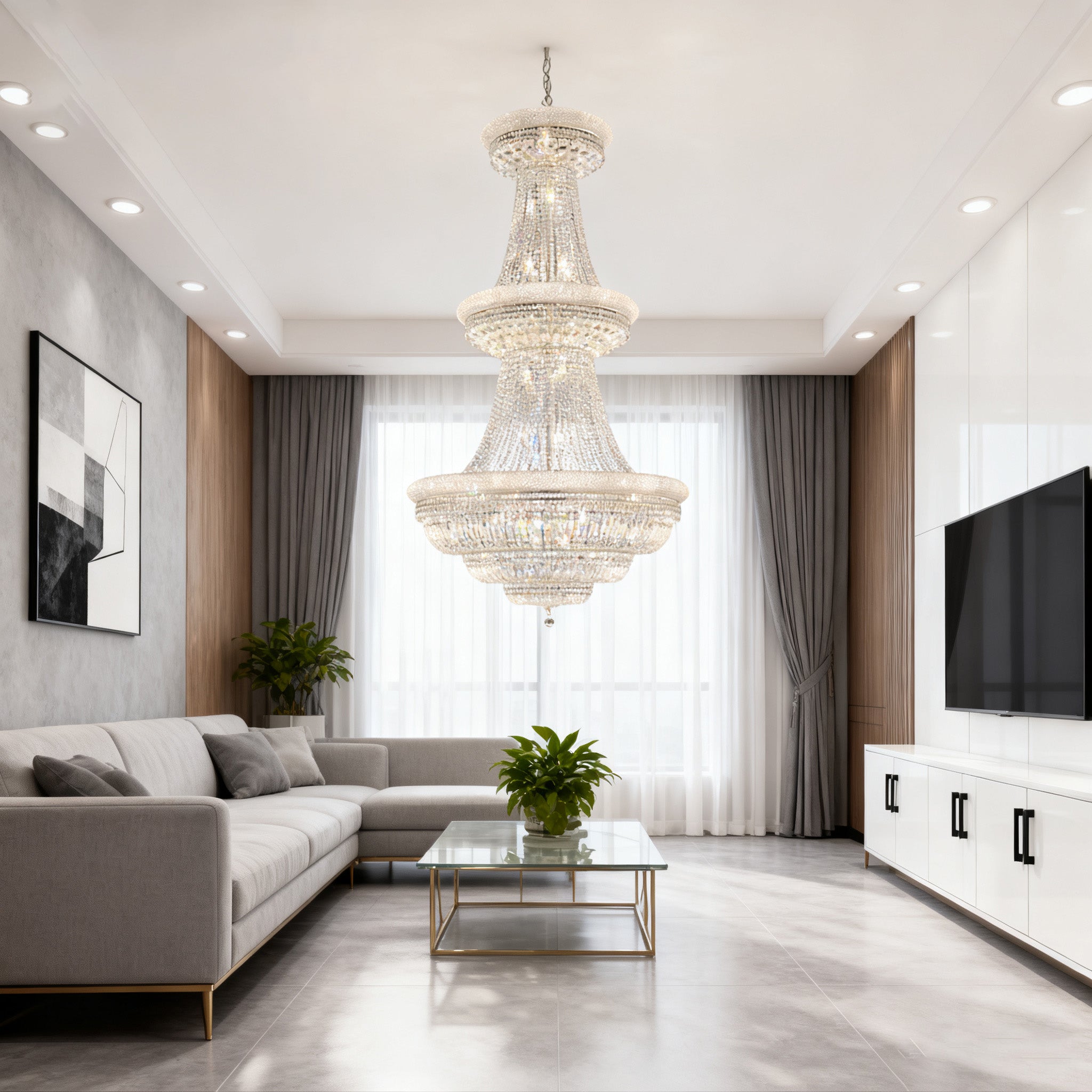 The empire crystal chandelier, available in both chrome and gold finishes, boasts dimensions of 42 inches in width and 76 inches in height, exuding an air of opulence and grandeur. Its elaborate crystal lighting design emits a radiant glow, making it an ideal addition to grand ballrooms, spacious foyers, or any area with lofty ceilings, infusing the space with luxury and sophistication.