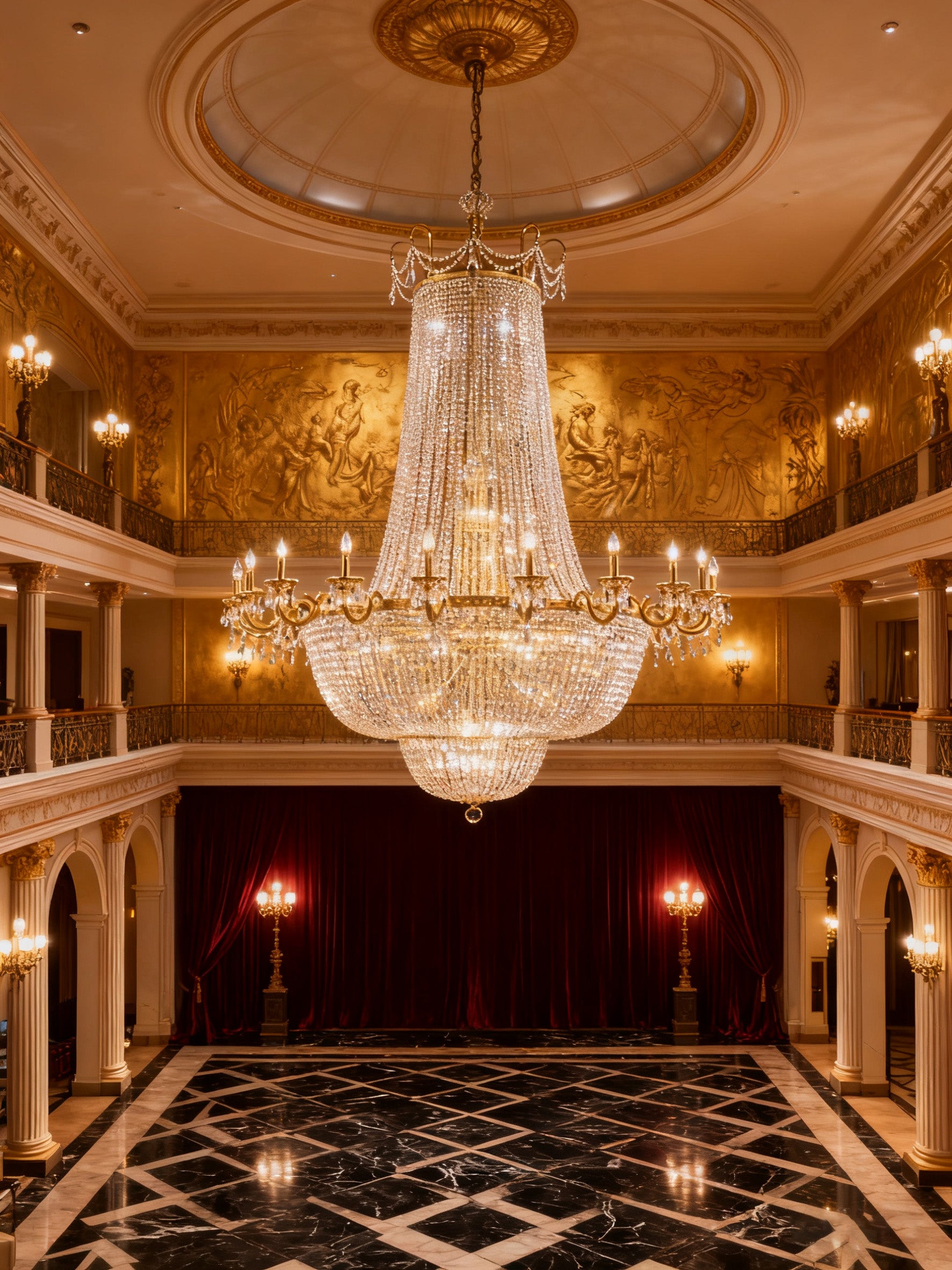 "Elegant gold-finished chandelier featuring a 160cm (63”) width and 170cm (67”) height. Crafted from metal and crystal, adorned with 60 lights for radiant illumination. A luxurious centerpiece blending timeless design with modern brilliance."