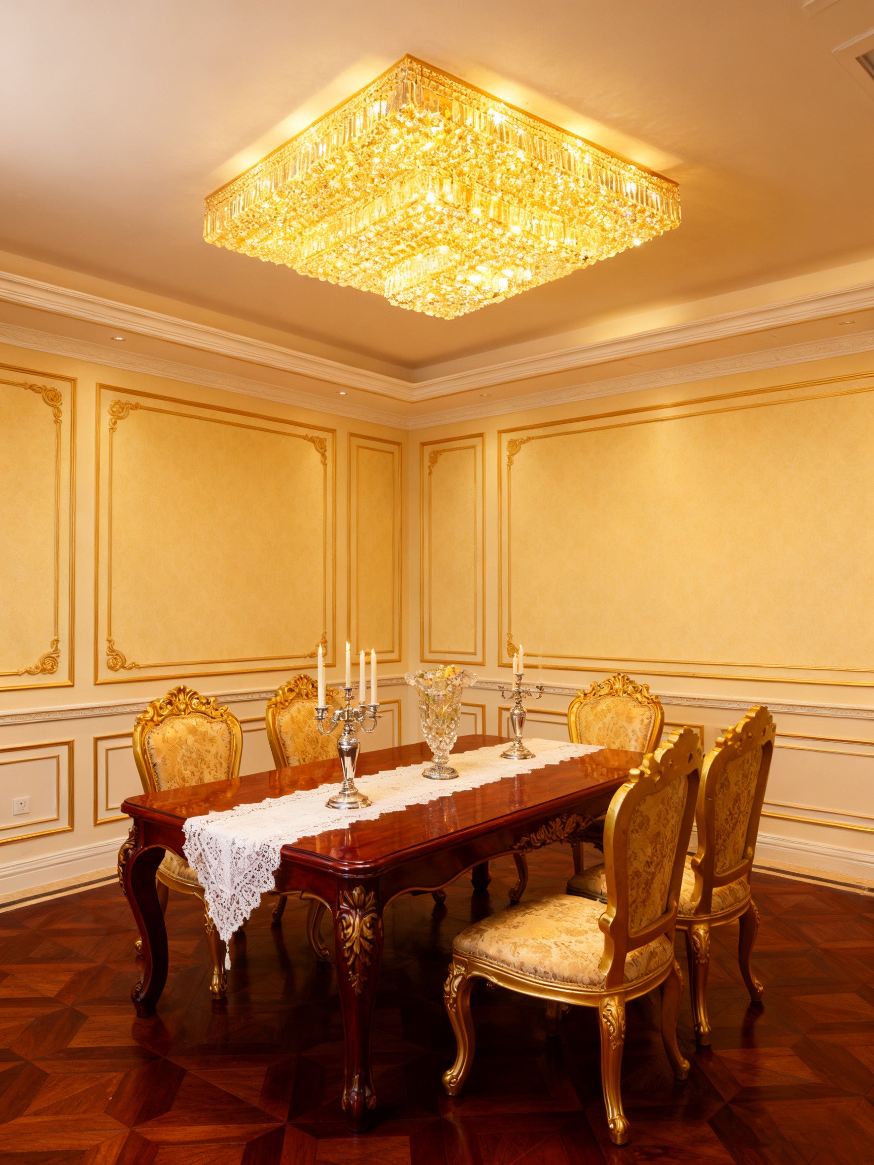 The 47'' square, 20'' high gold crystal chandelier is a magnificent ceiling light that exudes opulence. With three tiers of radiant beauty, this square chandelier adds a touch of grandeur to any room. Its luxurious design and warm golden hue make it a captivating centerpiece, casting a dazzling glow and infusing the space with an air of elegance and sophistication.