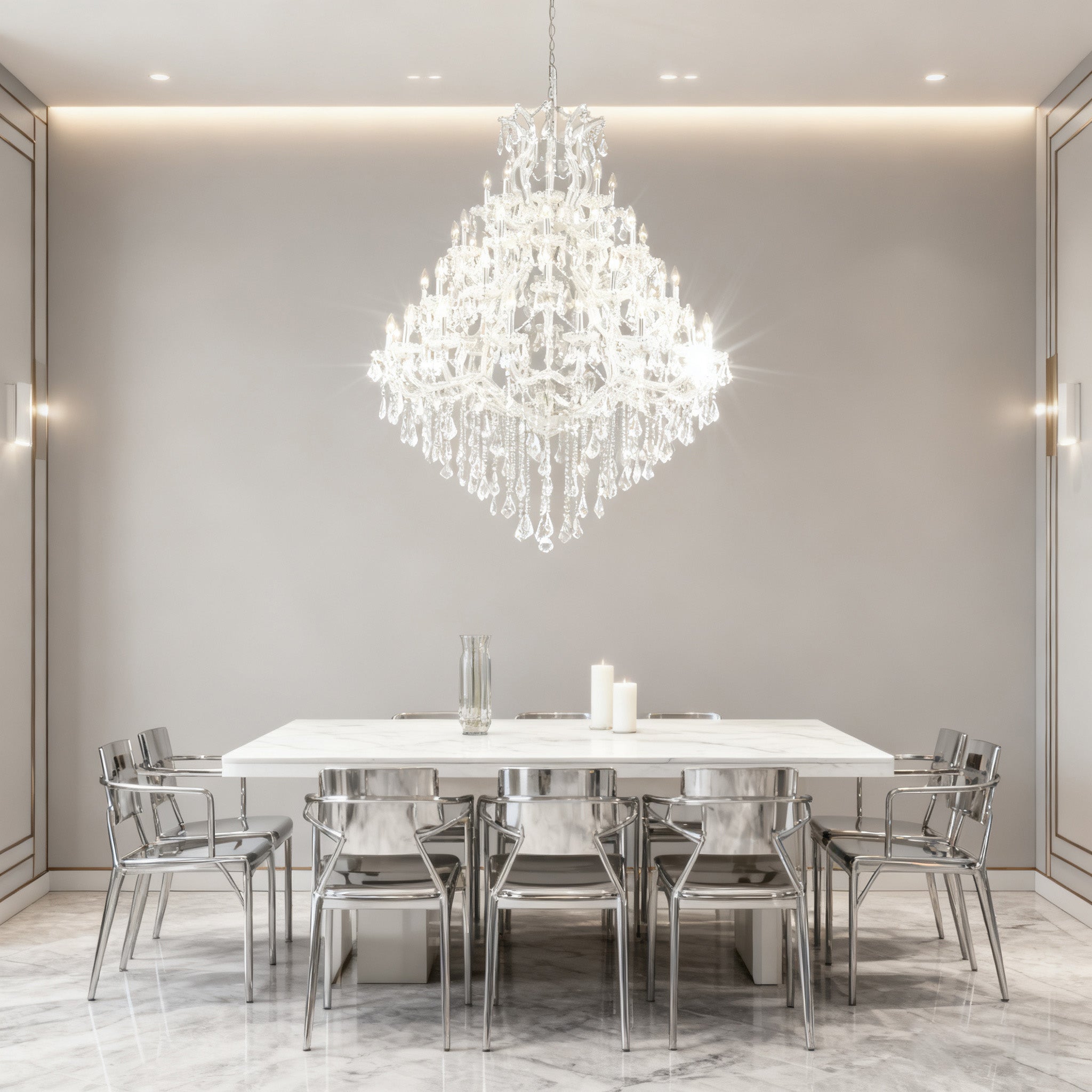 This big, tiered crystal chandelier, with 49 lamps arranged across four layers, exudes timeless elegance and grandeur. Perfect for a foyer, living room, or banquet hall, its resplendent glow creates an enchanting ambiance. The epitome of sophistication, this chandelier adds a touch of luxury to any space, captivating guests with its radiant allure and making it the perfect centerpiece for any special occasion.