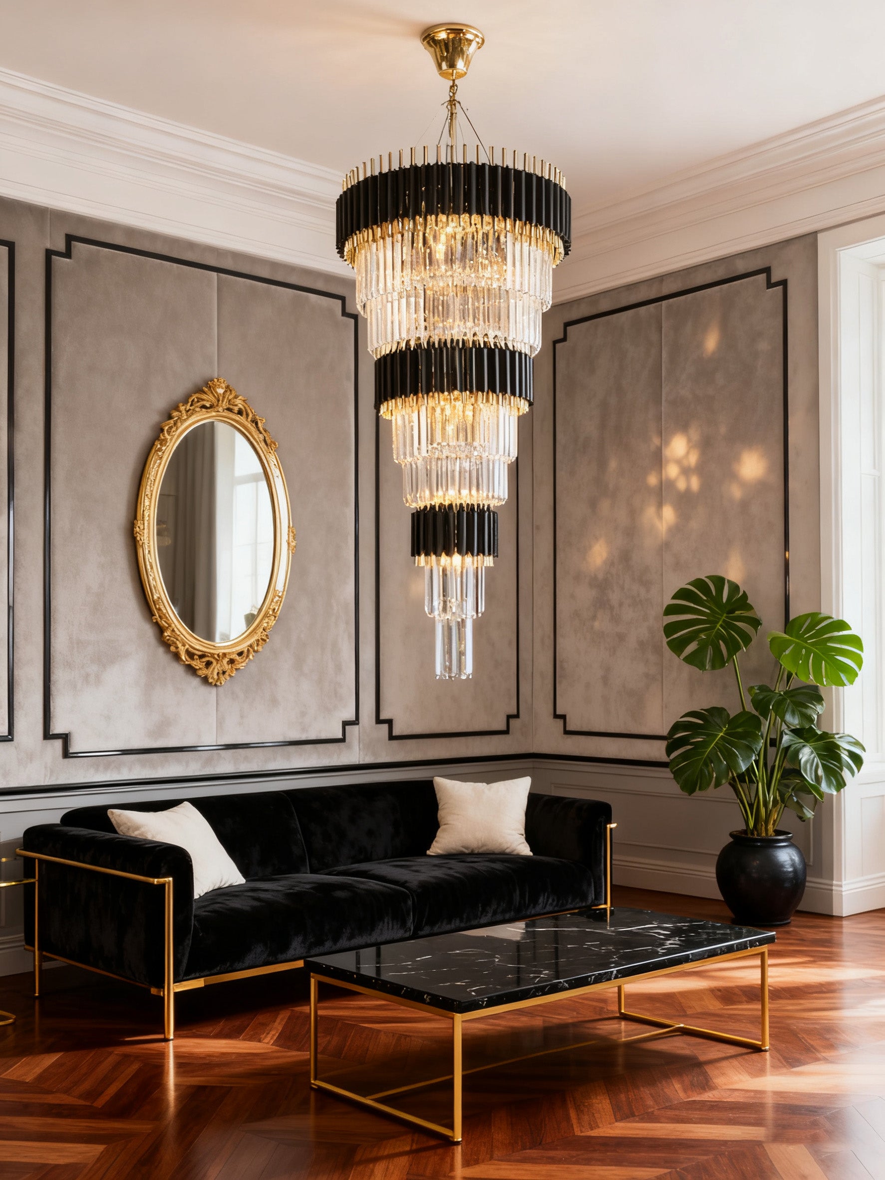 This striking lighting fixture combines contemporary elegance with dramatic contrast, featuring a slender 140cm (55") height and compact 60cm (24") width. The black and silver-gold metal frame creates a bold visual statement, while 27 precisely positioned lights illuminate faceted crystal elements for dazzling light refraction.