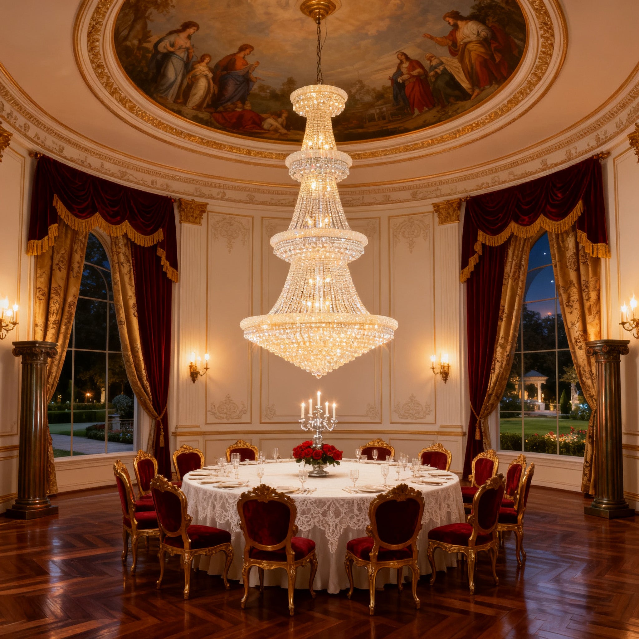 The empire crystal chandelier, specifically crafted for high ceilings, measures 54 inches wide and 96 inches high, exuding opulence and grandeur. Its intricate chandelier lighting design casts a radiant glow, making it a perfect fit for grand ballrooms, spacious foyers, or any area with lofty ceilings, adding a touch of luxury and sophistication to the space.