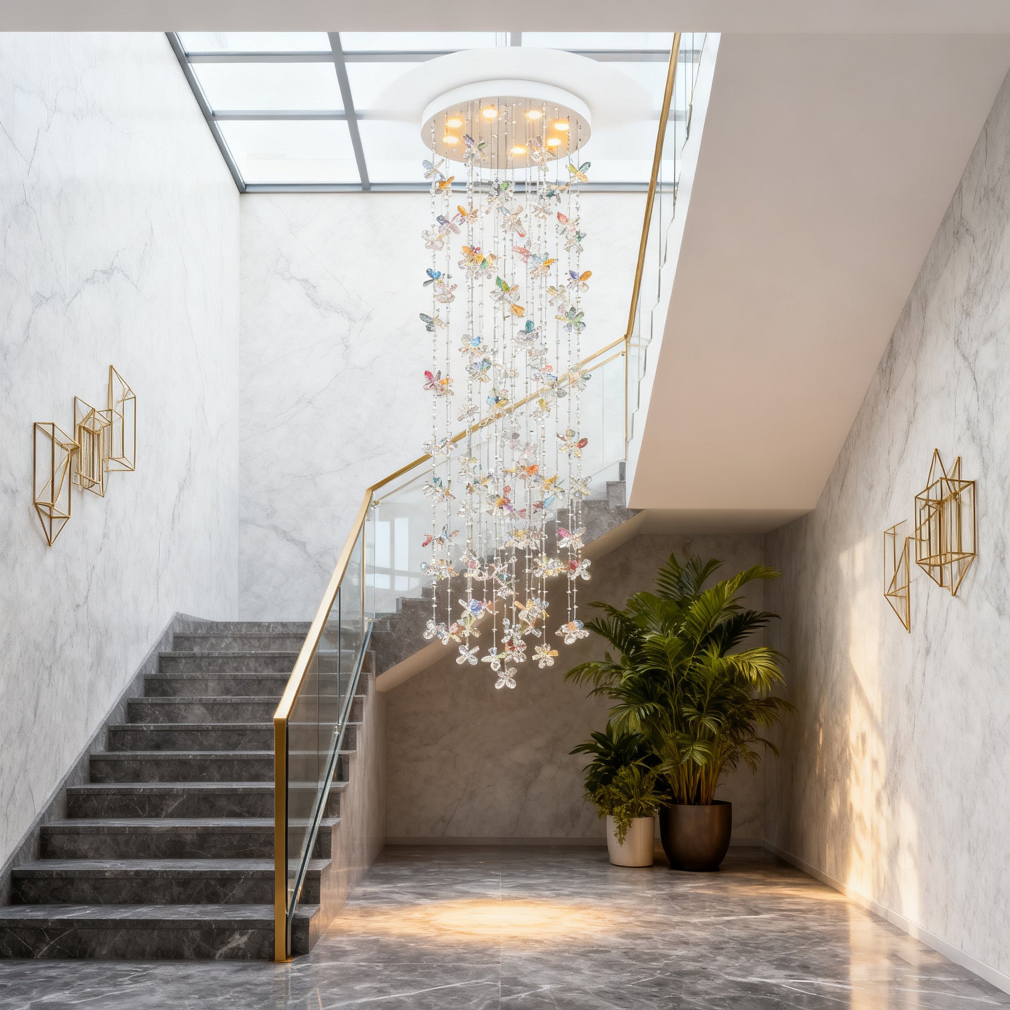 The modern long chandelier is a stunning crystal lighting fixture designed to enhance your staircase with elegance. This customizable chandelier adds a touch of luxury to any space. With its sparkling crystal accents, it creates a dazzling display of light and beauty. The size of the chandelier can be tailored to fit your staircase perfectly, making it a statement piece that elevates the ambiance of your home. Illuminate your staircase with this exquisite modern chandelier and create a captivating focal point.