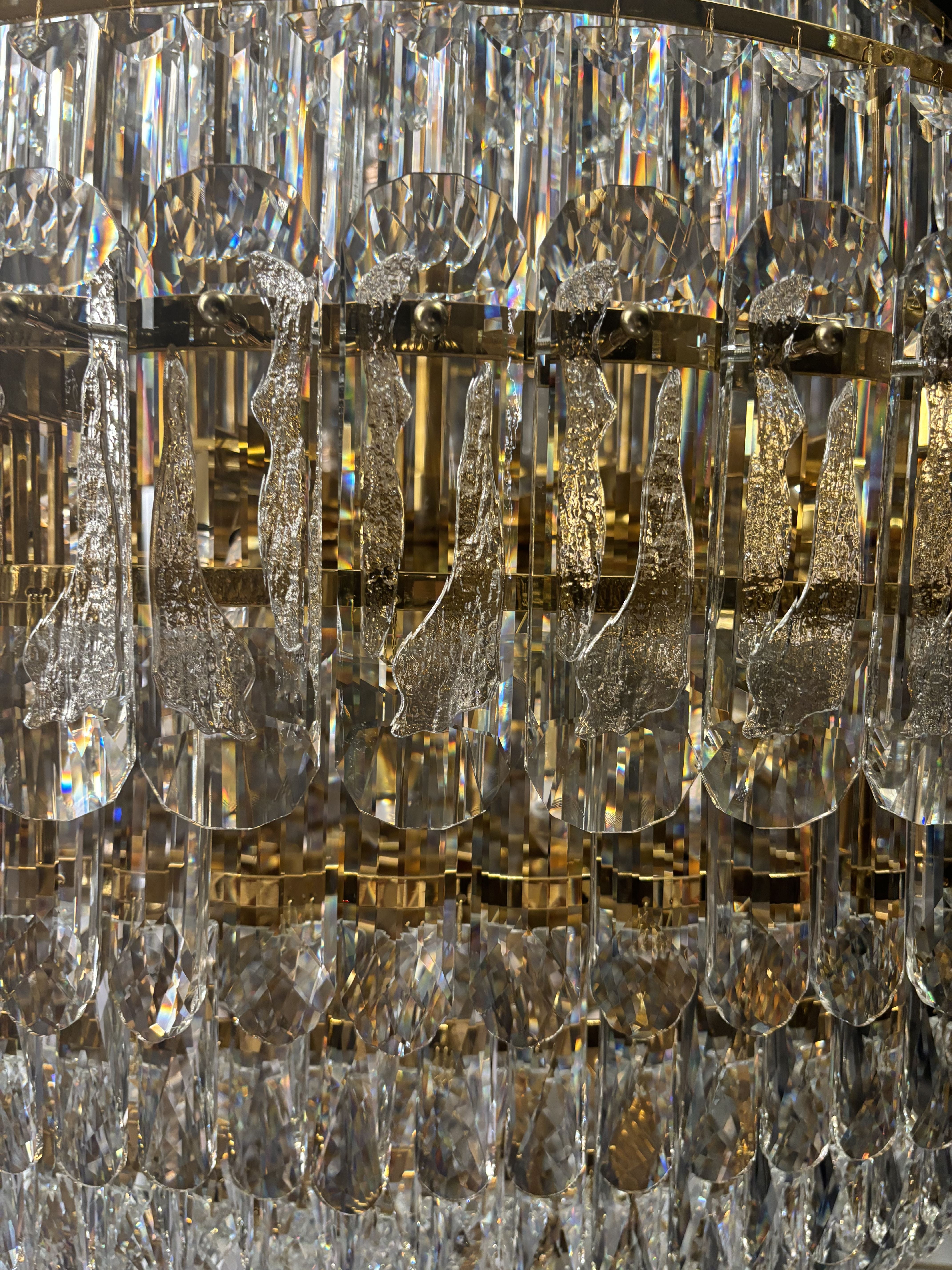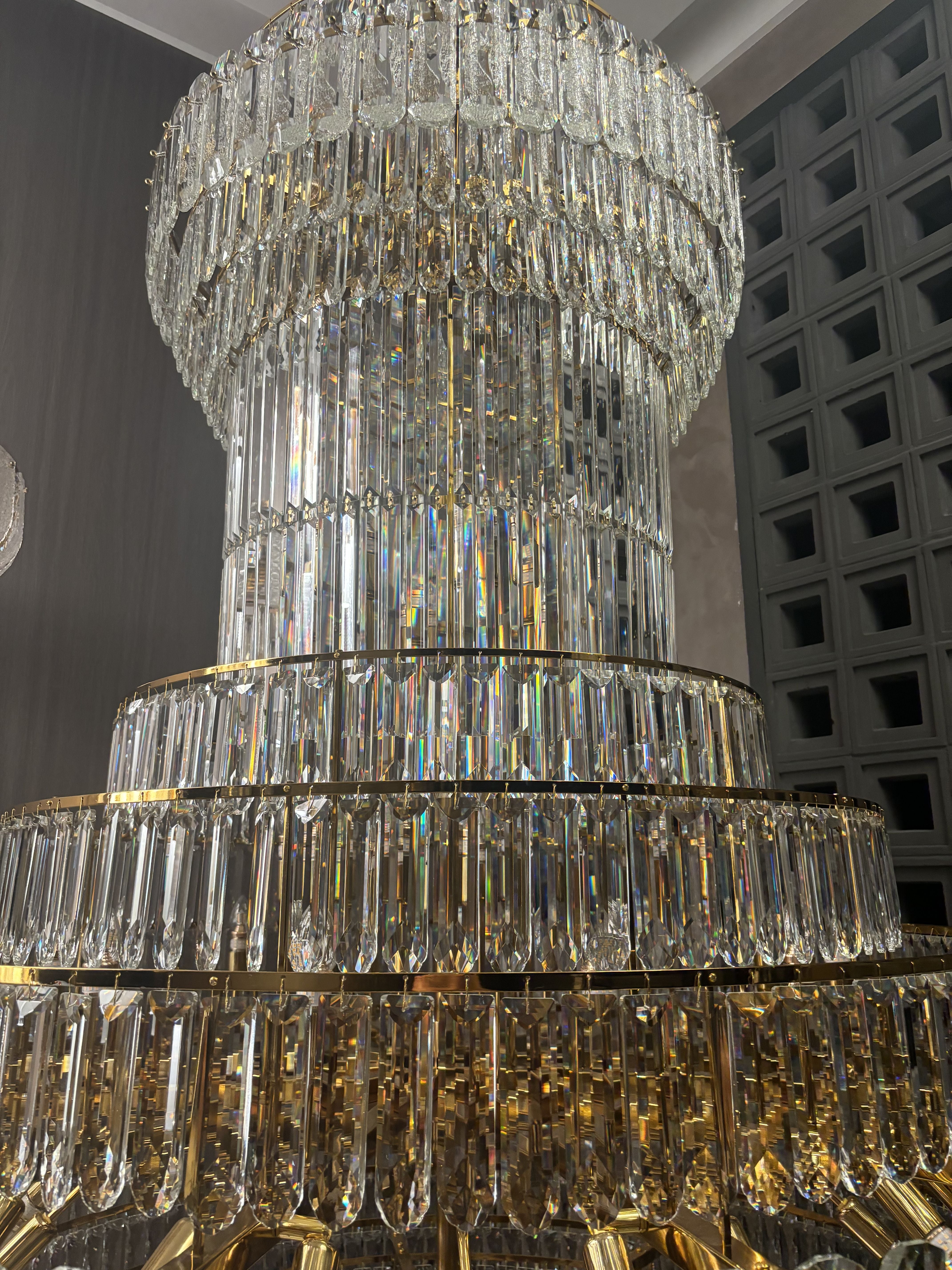 "Exquisite gold-finished chandelier with an impressive 180cm (71") width and towering 270cm (106") height. Featuring 70 E14 bulbs, this grand lighting masterpiece combines durable metal construction with dazzling crystal accents. The opulent design creates a breathtaking focal point, casting warm, radiant illumination perfect for luxurious ballrooms, hotel lobbies or palatial residences. Meticulously crafted for both exceptional durability and timeless elegance."