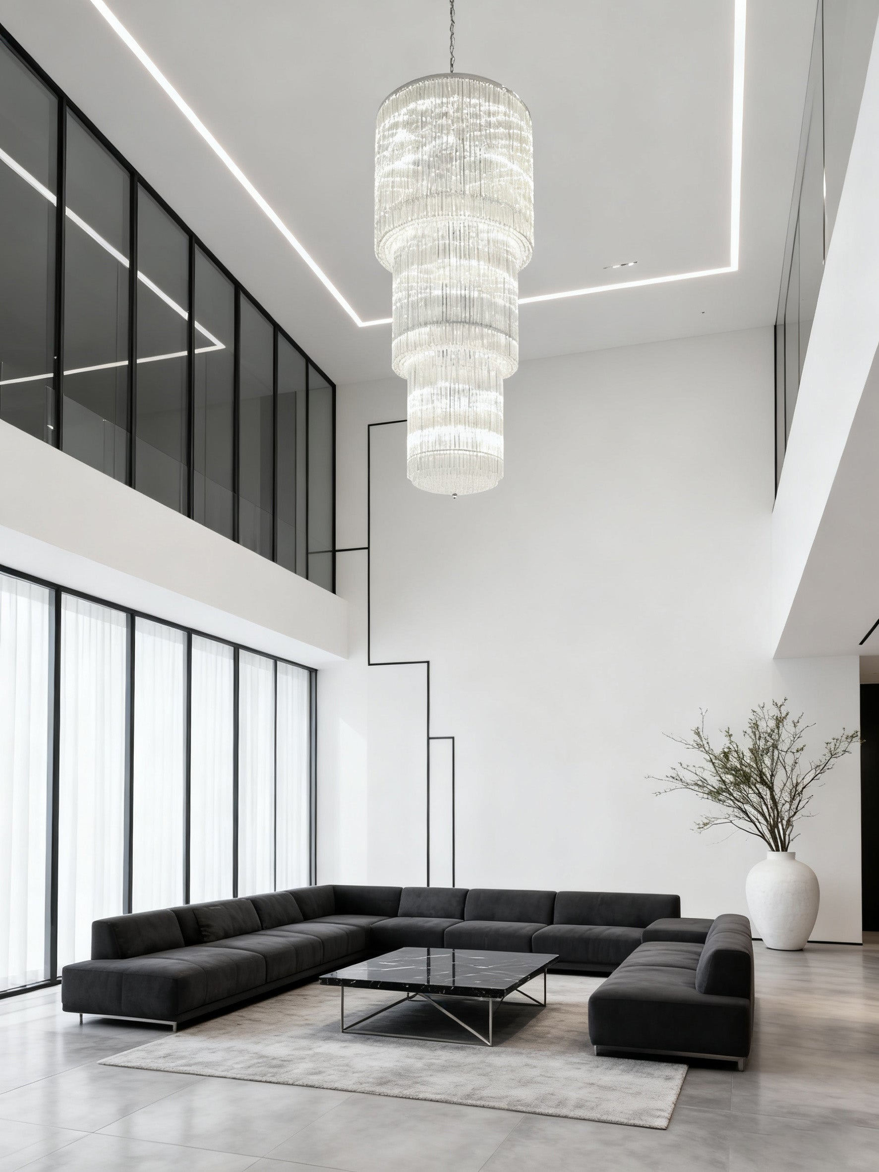 This magnificent 350cm (138") chandelier features 78 lights illuminating cascading glass elements on a polished chrome metal frame. Its generous 100cm (39") width creates dazzling light refraction, perfect for grand foyers or ballrooms. The sleek chrome finish radiates contemporary elegance.