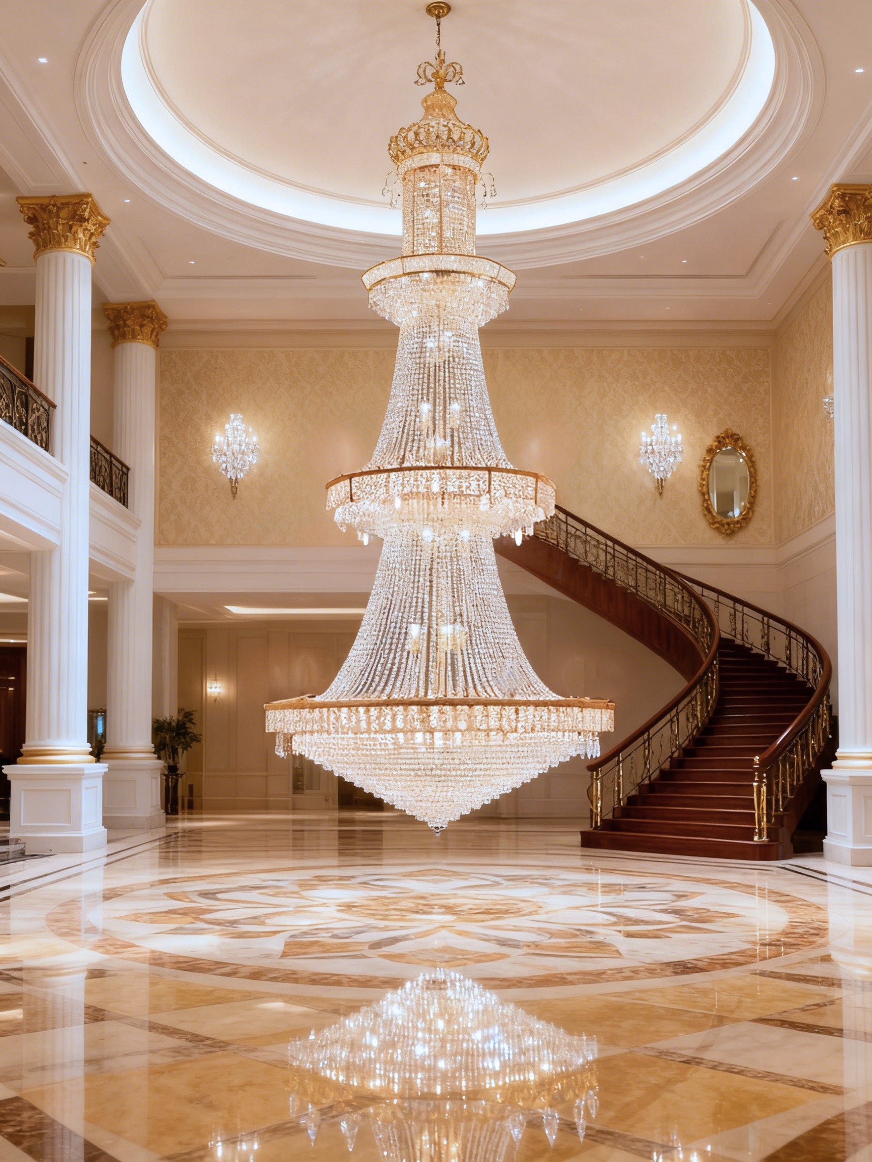 "Grand gold-finished chandelier measuring 130cm (51") wide and towering 300cm (118") tall. Featuring 52 brilliant lights with premium metal and crystal construction, this majestic lighting centerpiece creates a breathtaking focal point for palatial interiors."