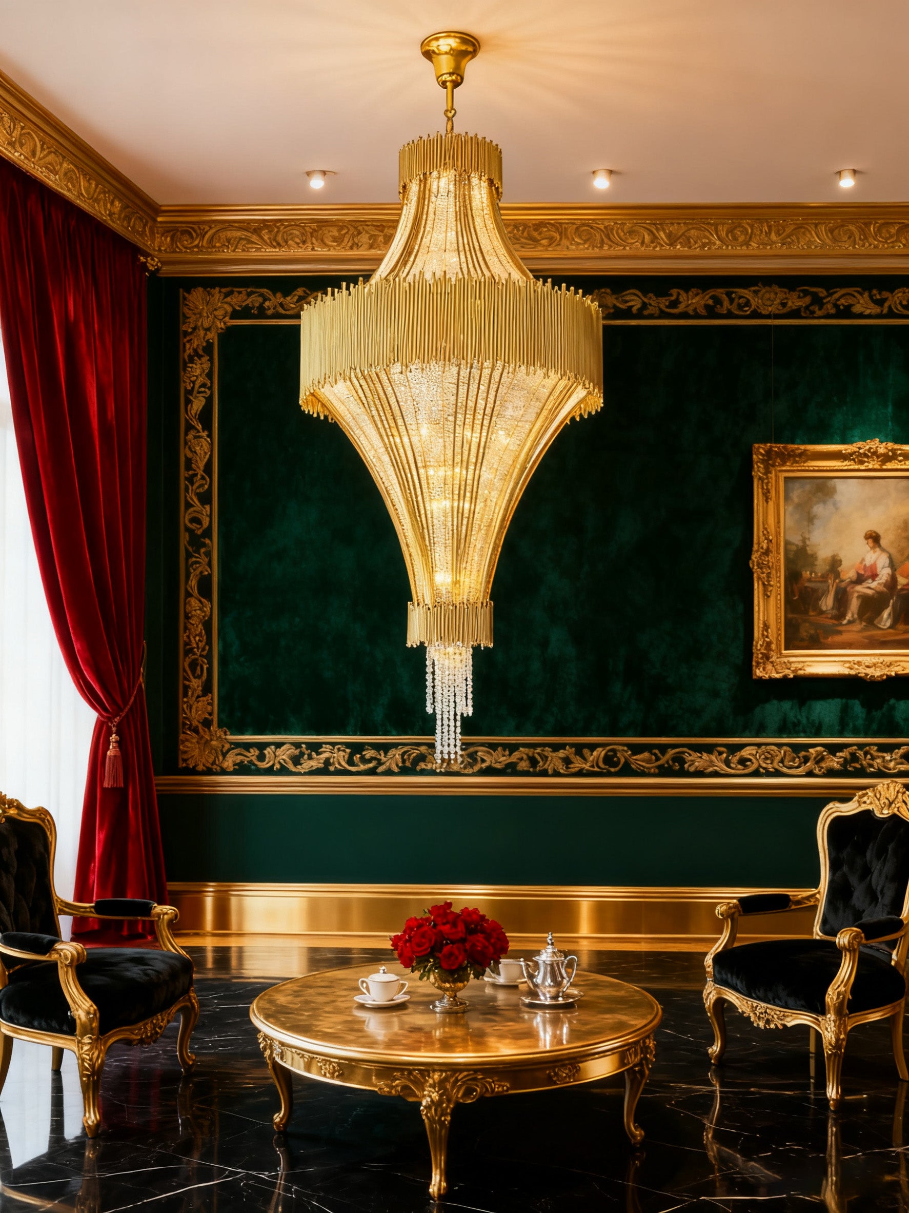 This opulent 235cm (93") chandelier features 45 E14 bulbs illuminating cascading crystals on a gold iron and stainless steel frame. Its 120cm (47") width creates spectacular light refraction, ideal for grand interiors. The lavish gold finish exudes timeless sophistication.