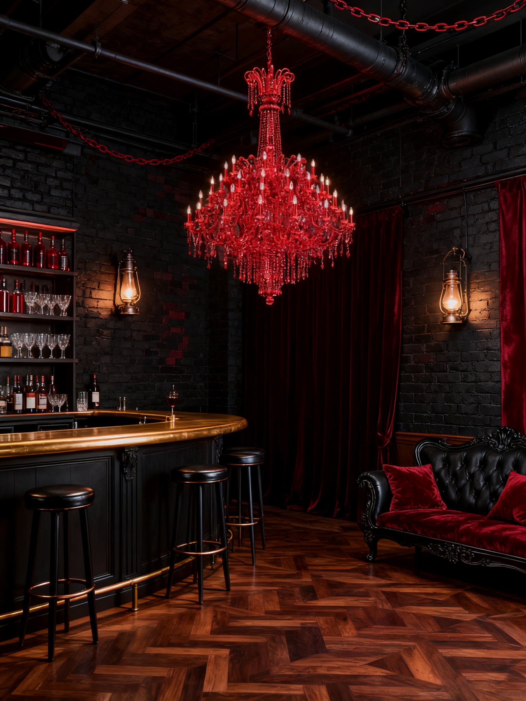 "Dramatic red-finished chandelier measuring 185cm (73") wide and 240cm (94") tall. Featuring 56 brilliant lights with iron, crystal and glass construction, this bold lighting centerpiece creates a striking focal point for contemporary luxury spaces."