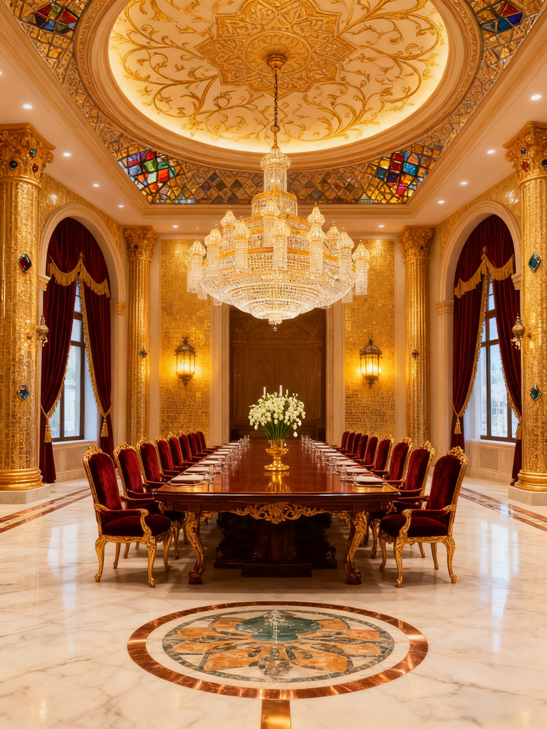 "Majestic gold-finished chandelier spanning 245cm (96") wide and towering 265cm (104") high. Featuring 120 brilliant lights with premium metal and crystal construction, this palatial lighting masterpiece creates a breathtaking focal point, radiating regal illumination for grand ballrooms and luxury estates."