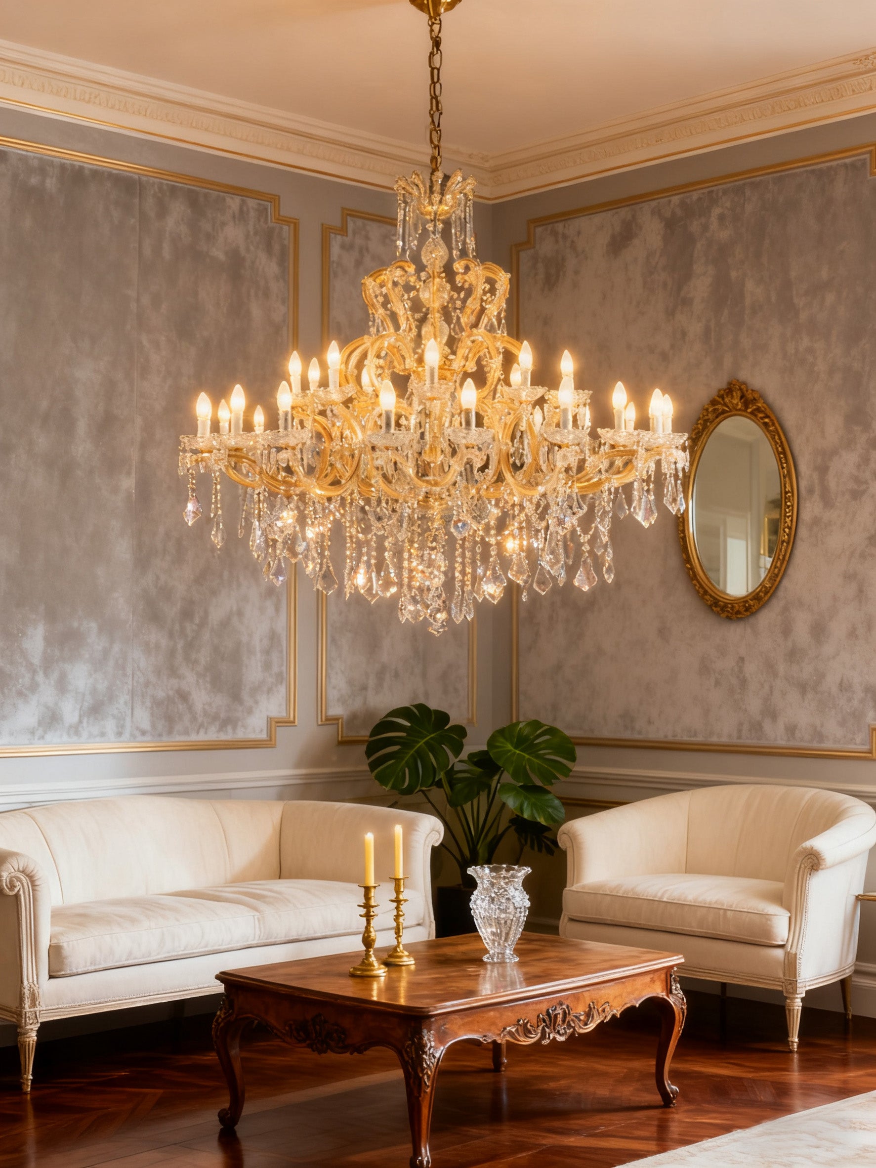 This candle-style Maria Theresa crystal chandelier, with 30 lamps across two layers, exudes timeless elegance and charm. Perfect for a dining room, its resplendent glow creates an enchanting ambiance. The epitome of sophistication, this chandelier adds a touch of luxury to any space, captivating guests with its radiant allure and making it the perfect centerpiece for any special occasion.