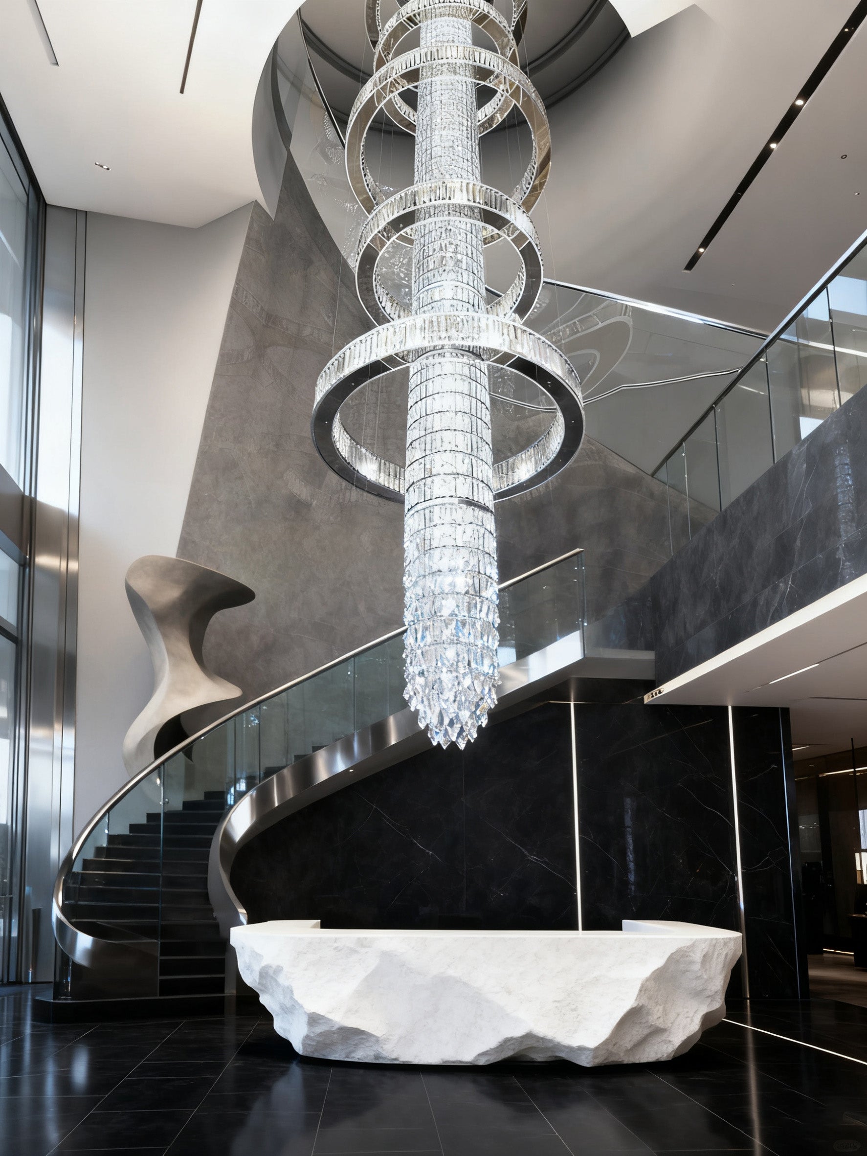 This magnificent 550cm (217") tall chandelier creates a stunning visual impact with its slender 120cm (47") width, perfect for grand entryways and soaring ceilings. The polished chrome metal frame exudes contemporary sophistication, while 94 strategically placed E14 sockets allow for customizable illumination through warm or cool white bulbs.