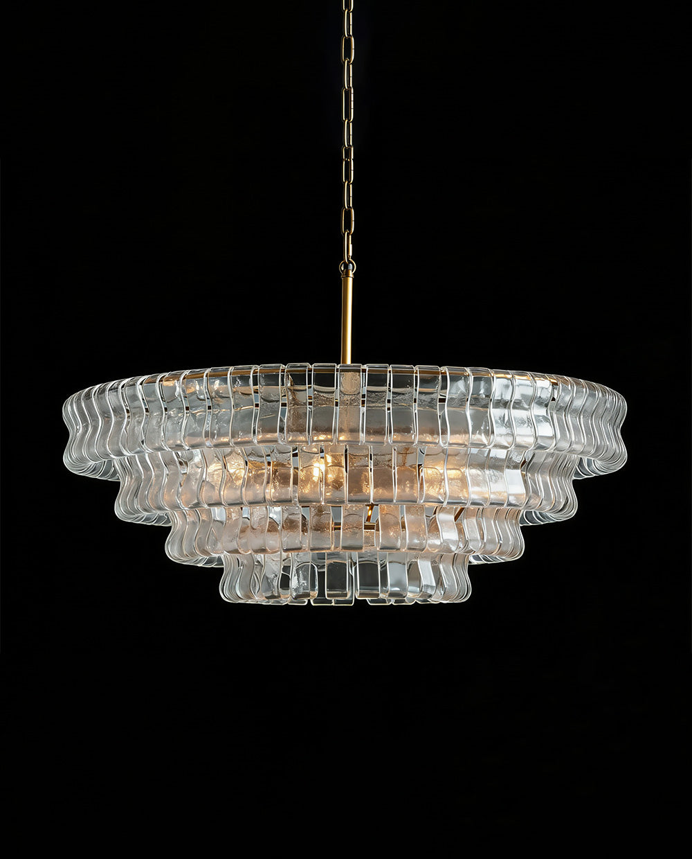 This chandelier is made of metal and glass, with brass or bronze finish for elegance. It has E12 light sources and multi-layer wavy glass components, a cascading design that’s dynamic and grand. Suitable for various spaces, it allows customized size and finish, being a great choice with both artistry and practicality.