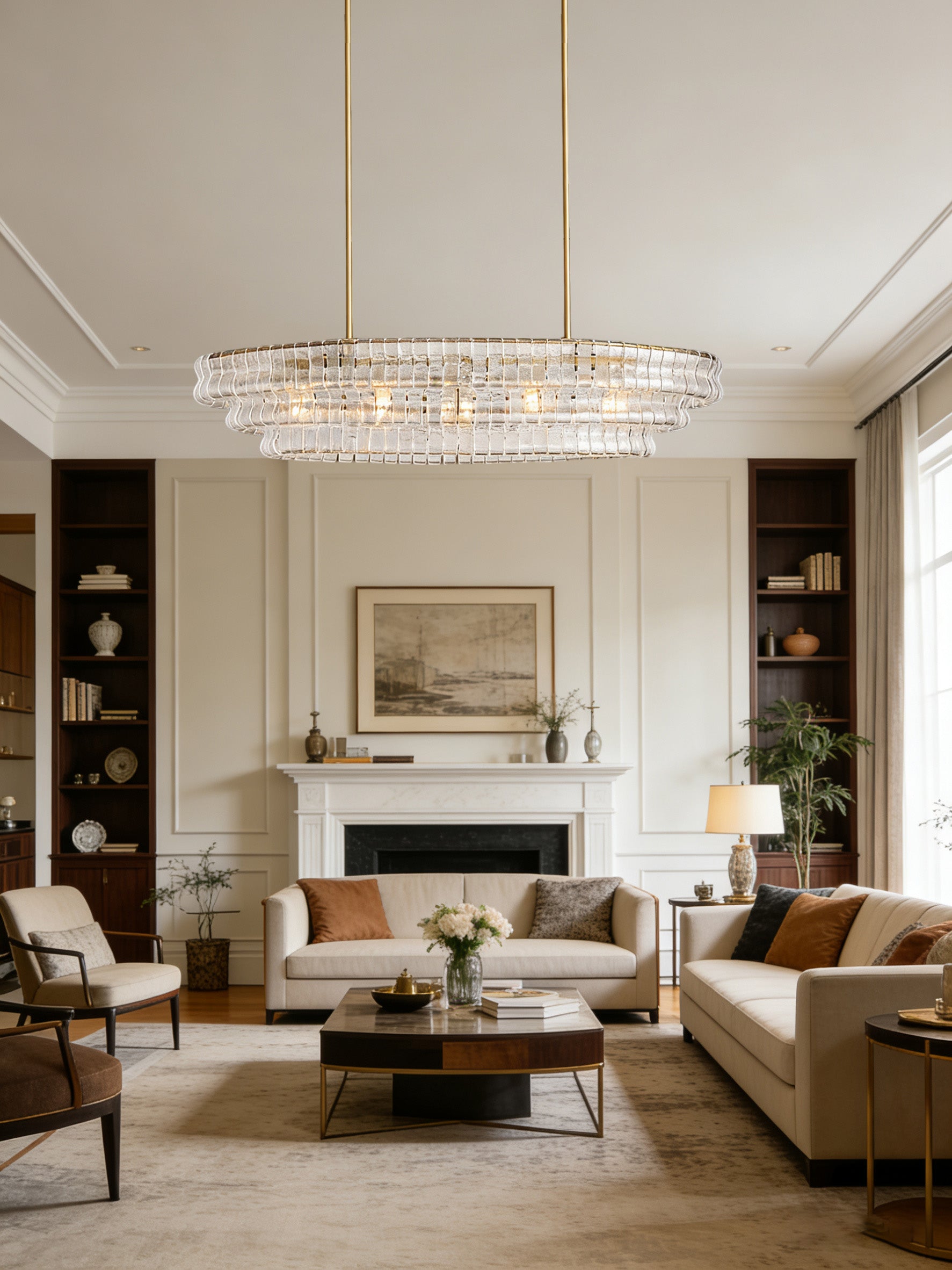 This chandelier is made of metal and glass, with brass or bronze finish for a stylish look. It features 5 E12 light sources with multi-layer wavy glass components, a linear cascading design that’s modern and grand. Suitable for various spaces, it offers customizable size and finish, combining artistry and functionality.