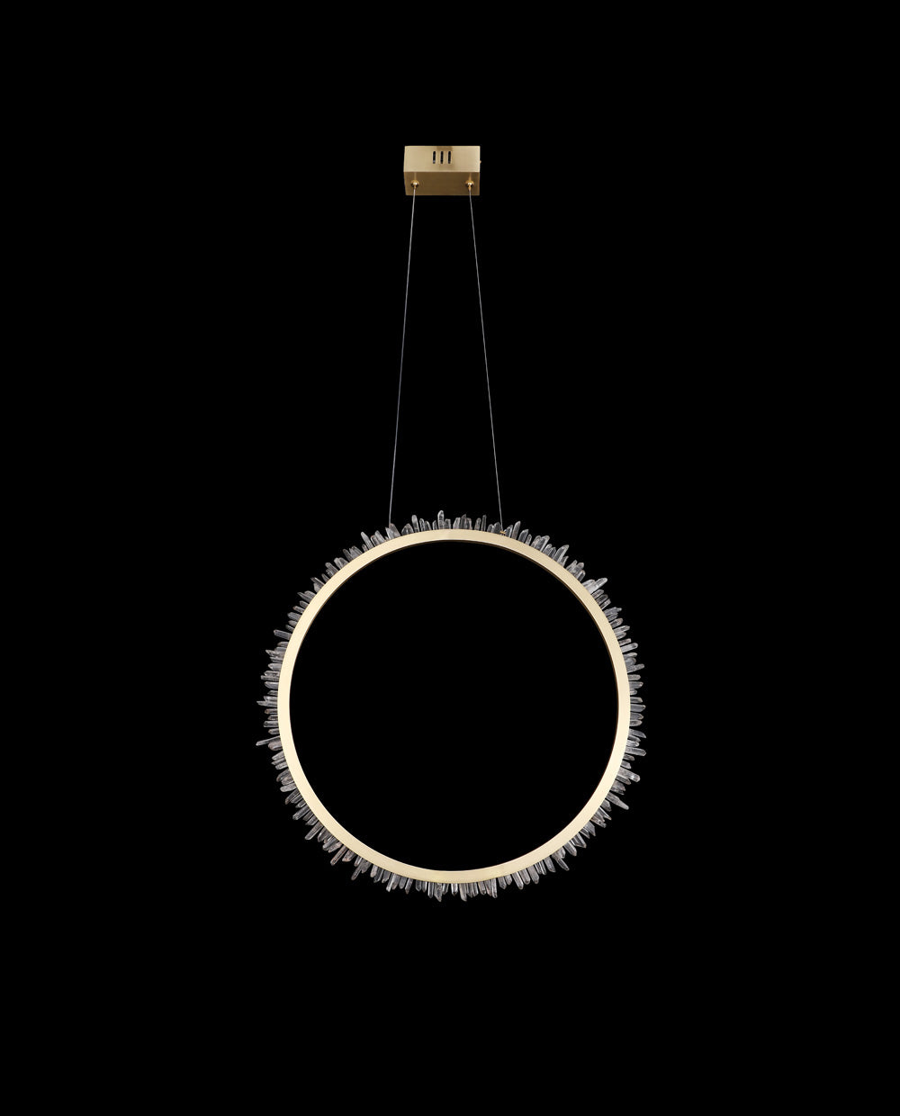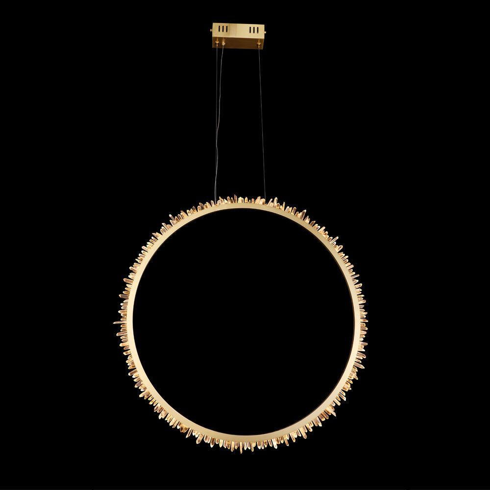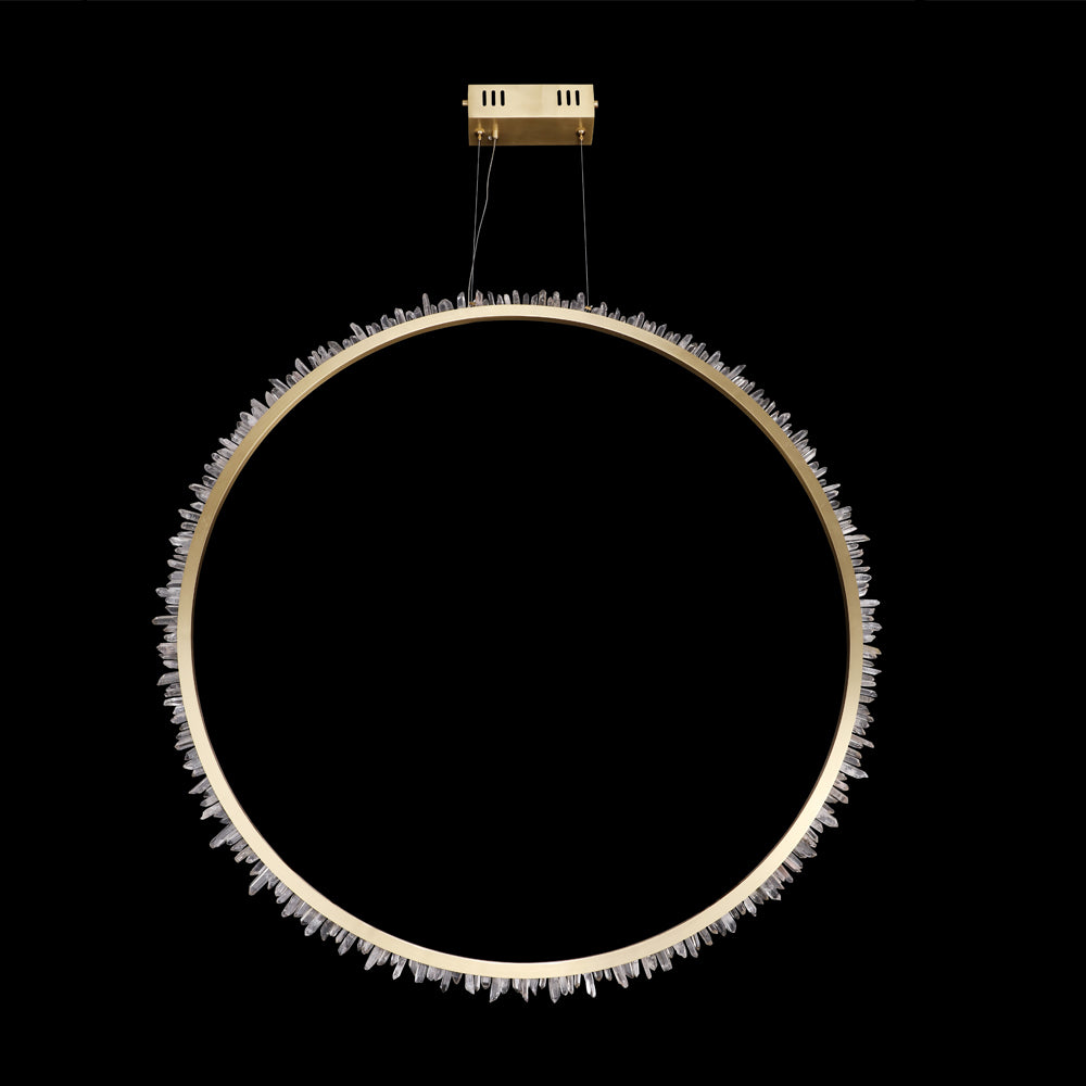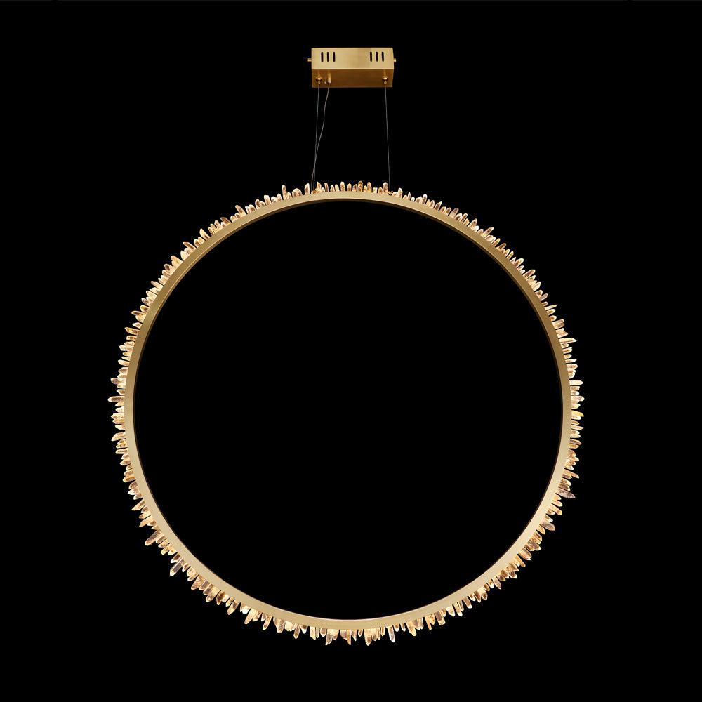 This stunning circular pendant light features a Brass finish. Crafted from Brass and Natural Crystal, it comes in diameters like 40 - 100cm (custom sizes available). It adds a touch of luxury and natural charm to any space.
