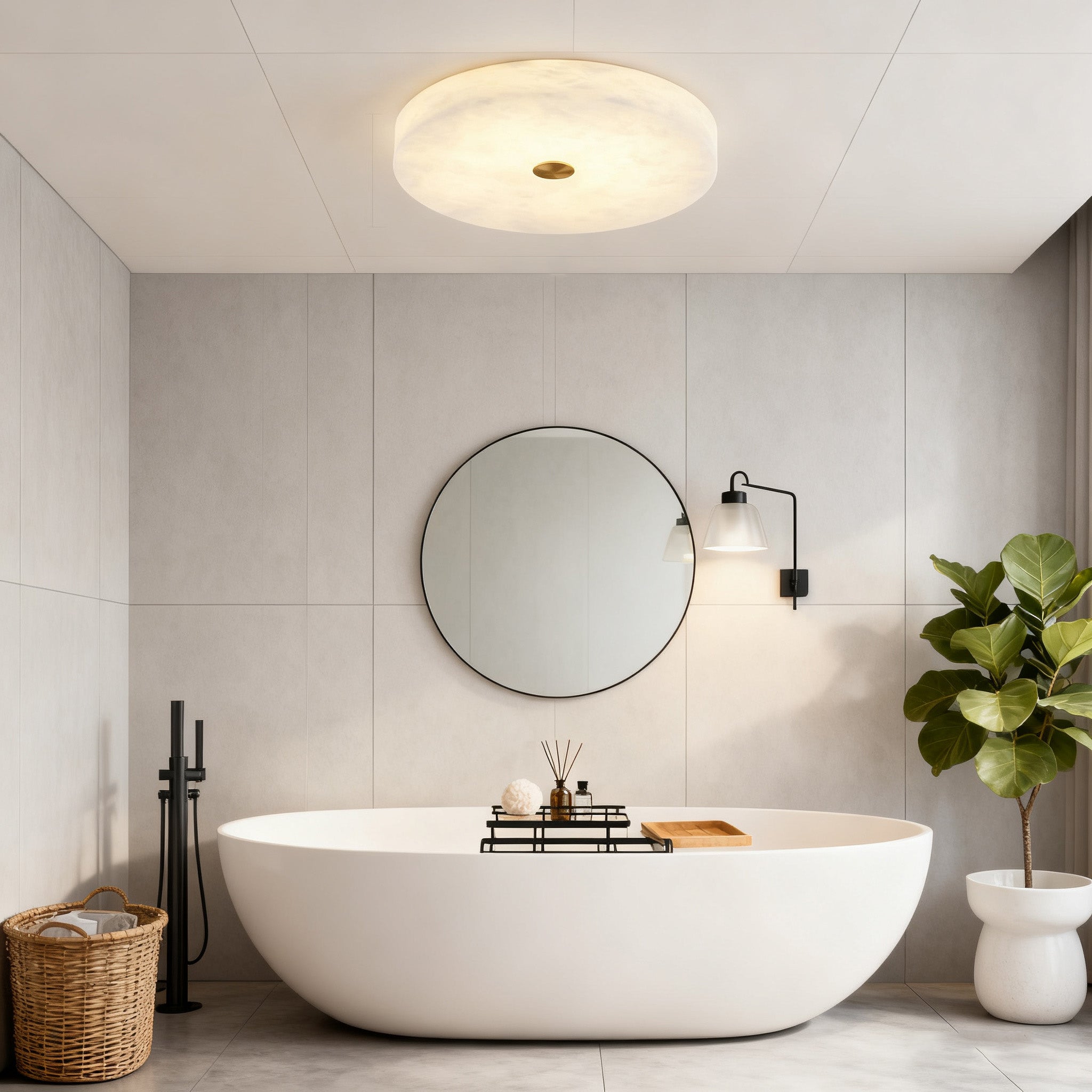 Embrace a warm ambiance with this elegant alabaster flush mounted chandelier. Crafted from genuine alabaster, this LED ceiling light diffuses a soft, inviting glow. Choose from 16", 20", or 24" diameters to perfectly complement your space, whether it's a cozy entryway, a modern bathroom, or a luxurious walk-in closet. The timeless design adds a touch of sophistication, making it ideal for a variety of contemporary settings.