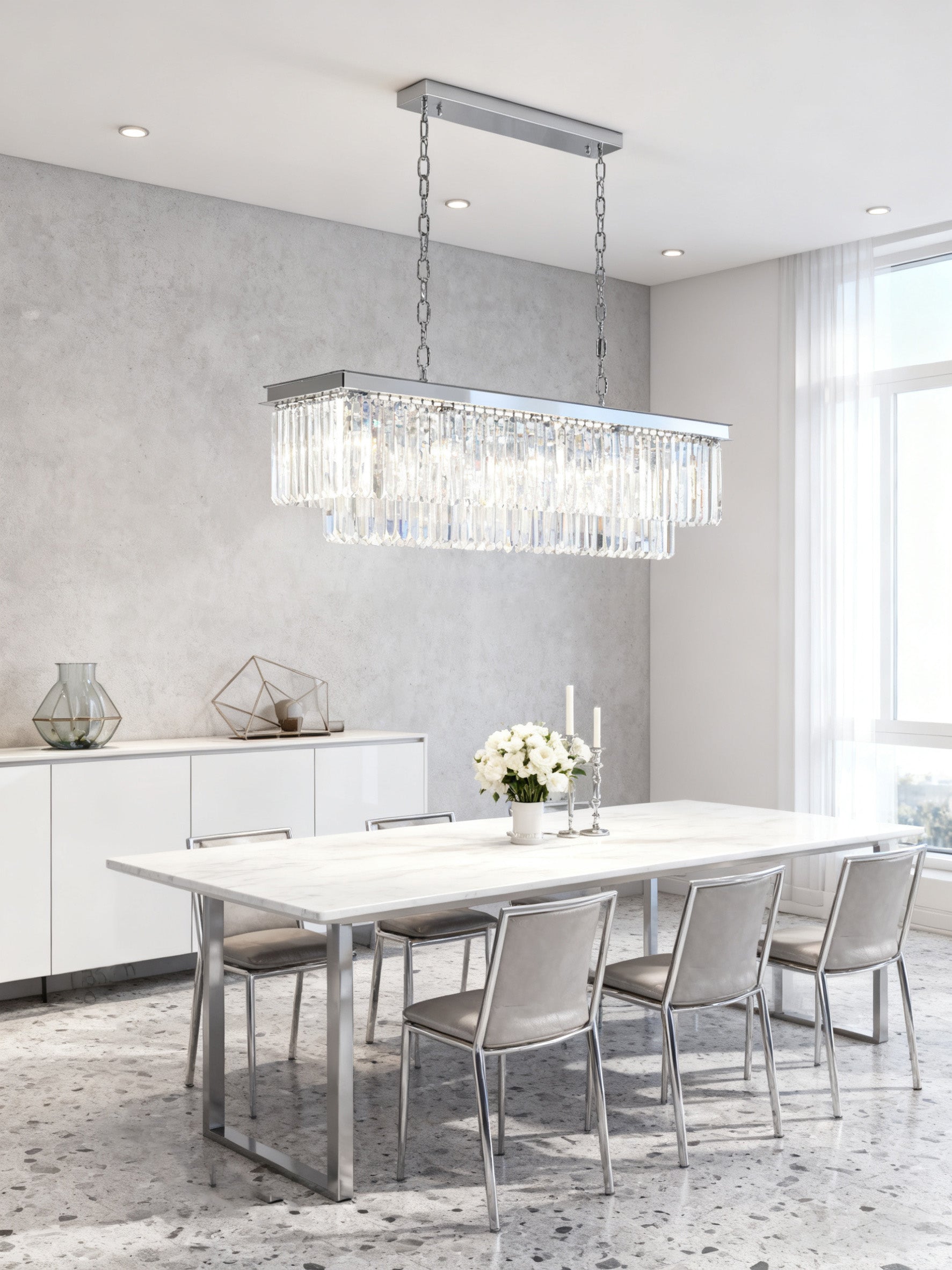 The modern crystal chandelier is a stunning rectangular lighting fixture that exudes contemporary elegance. Crafted with chrome metal and crystal materials, it combines sleekness with a touch of glamour. Available in two lengths, 31.5'' and 40'', it offers options for different dining room and kitchen island sizes. This chandelier serves as a focal point, illuminating the space with a dazzling display of light. Its clean lines and sparkling crystals create a sophisticated ambiance, making it the perfect choice for adding a touch of luxury to your dining room or kitchen island.