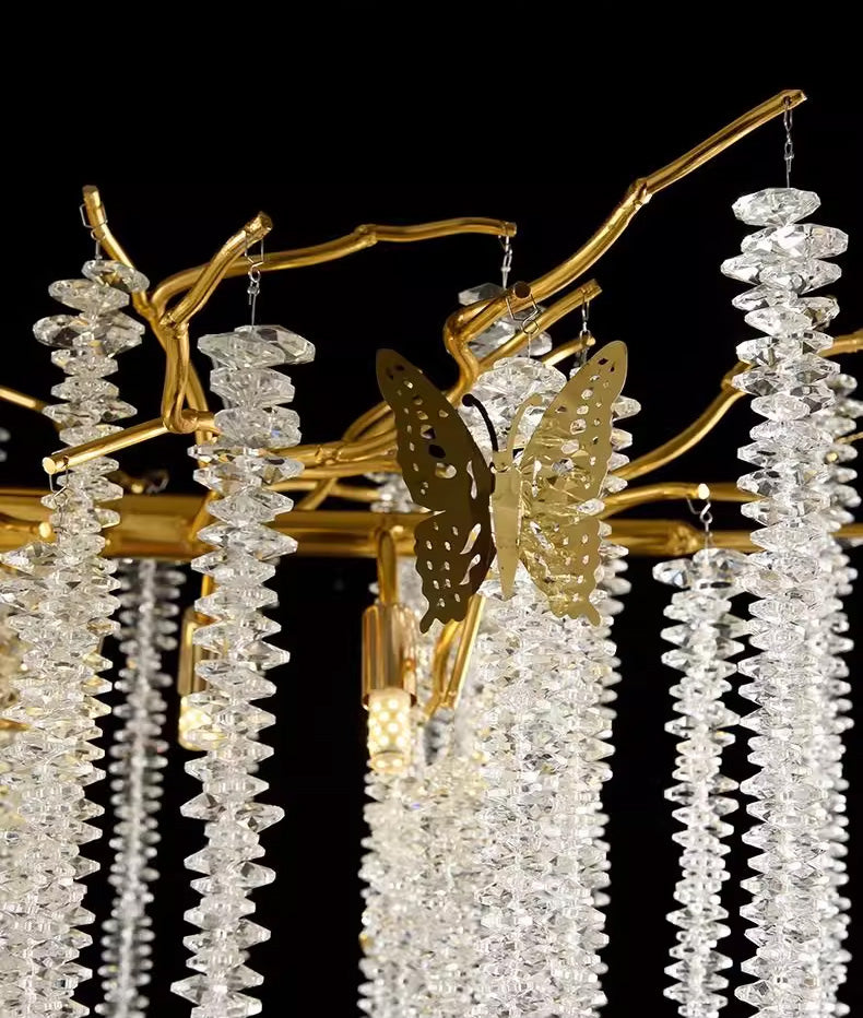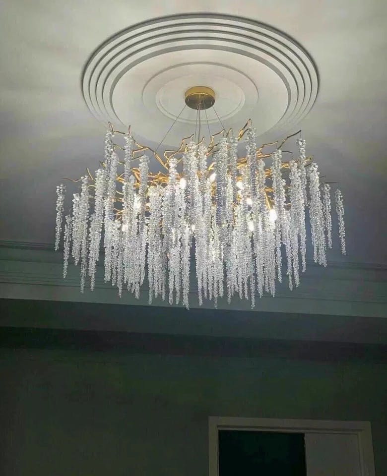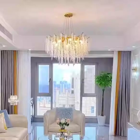 it looks so grand! The branch frame hangs from above without overwhelming the space — crystal curtains sway slightly with the breeze, and light and shadow move along; on weekends, curling up on the sofa to read novels, looking up at "flowing starlight"