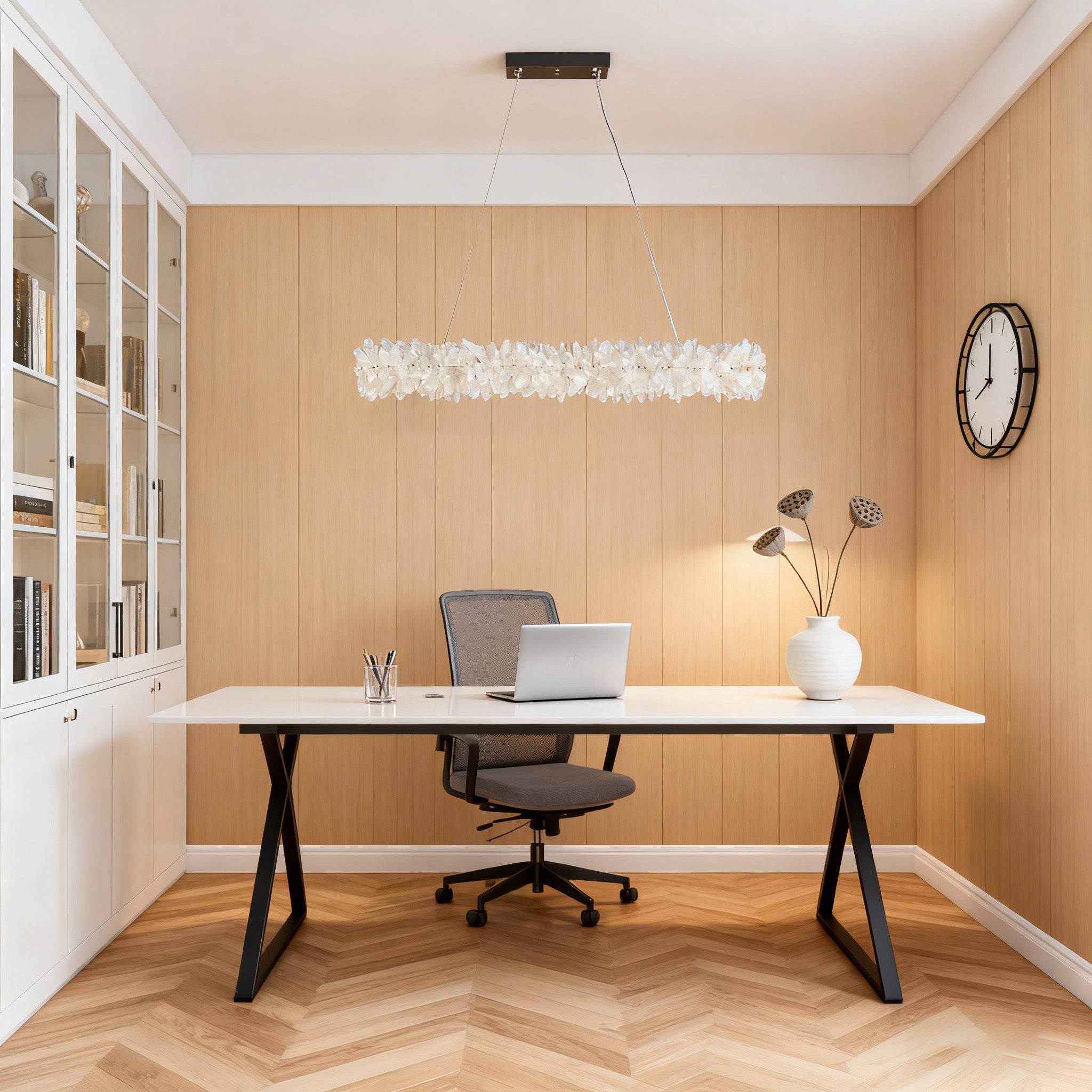 This linear pendant light showcases a Chrome finish. Crafted from Iron, Stainless Steel, and Natural Crystal, it measures 10cm in width and 100cm in length, with 65W lights. The white crystal cluster creates a stunning, elegant ambiance, ideal for modern spaces.