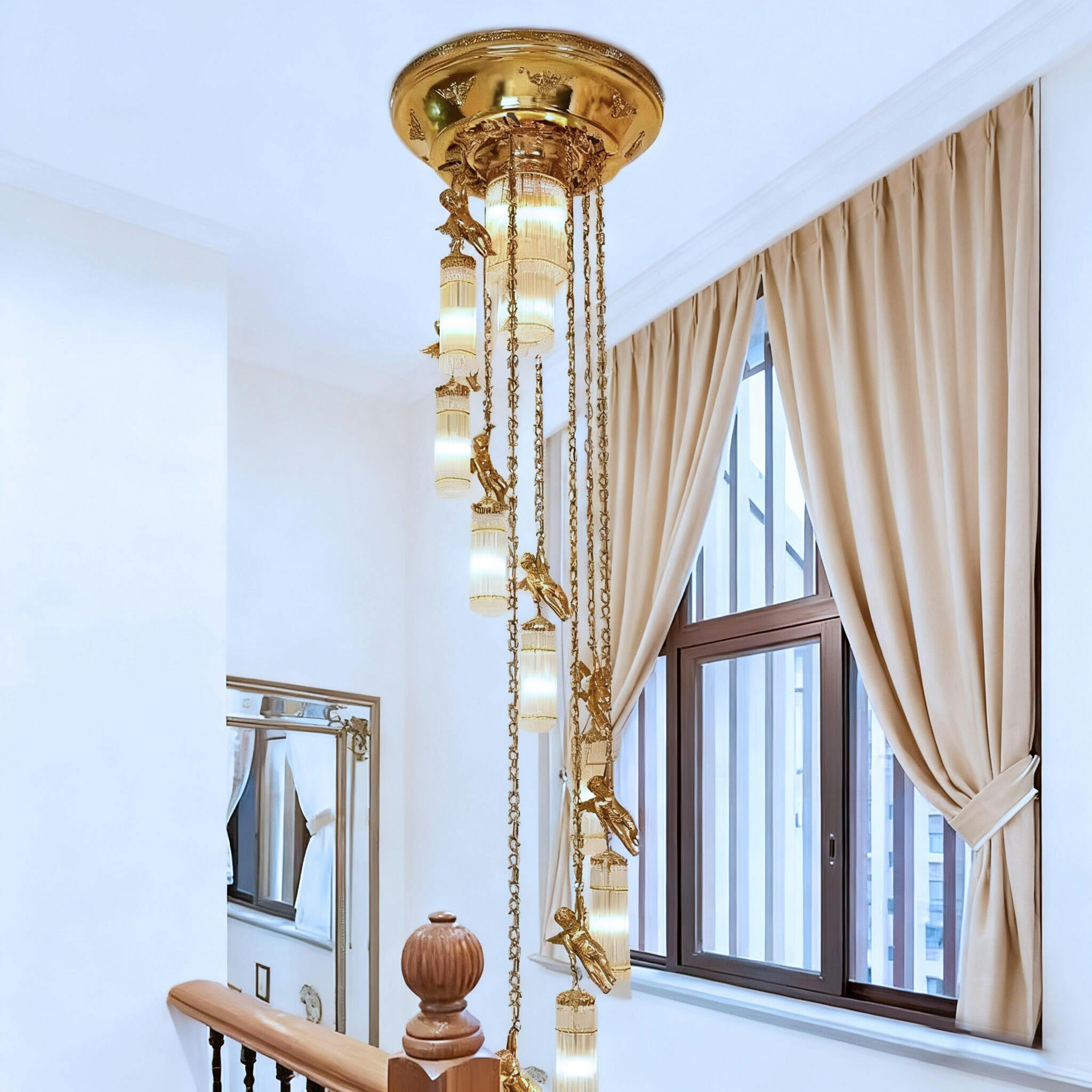 Adorn your grand staircase with this cascading long chandelier. Made of gleaming brass, this 138-inch high masterpiece boasts a width of 31 inches, offering a touch of elegance without overwhelming your space. Eight sparkling lights are strategically placed throughout the fixture, beautifully illuminating your entryway. Featuring a unique design with eight graceful angels perched along the frame, this chandelier is sure to be a captivating focal point. Applicable space: Perfect for foyers, entryways, and hallways with high ceilings.