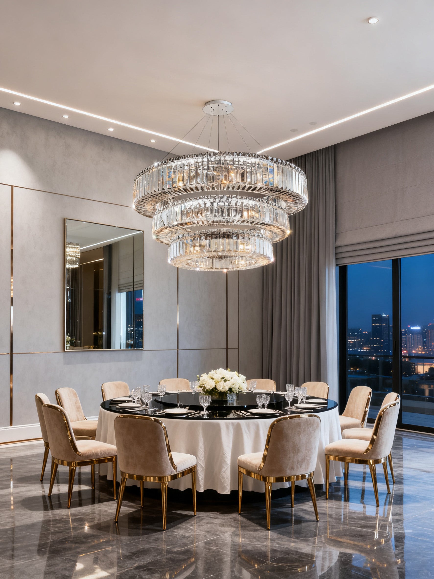 A modern chandelier is a captivating lighting fixture that adds a touch of glamour to any space. Ideal for banquet halls or living rooms, this crystal chandelier exudes elegance and sophistication. It consists of 3 crystal rings at diameter 48'', 36'' and 24'', with the option to customize the size to suit individual preferences. With its dazzling crystals and contemporary design, this chandelier creates a stunning focal point, illuminating the room with a radiant glow.